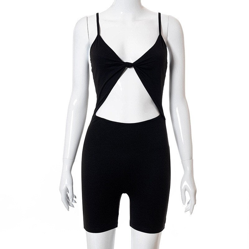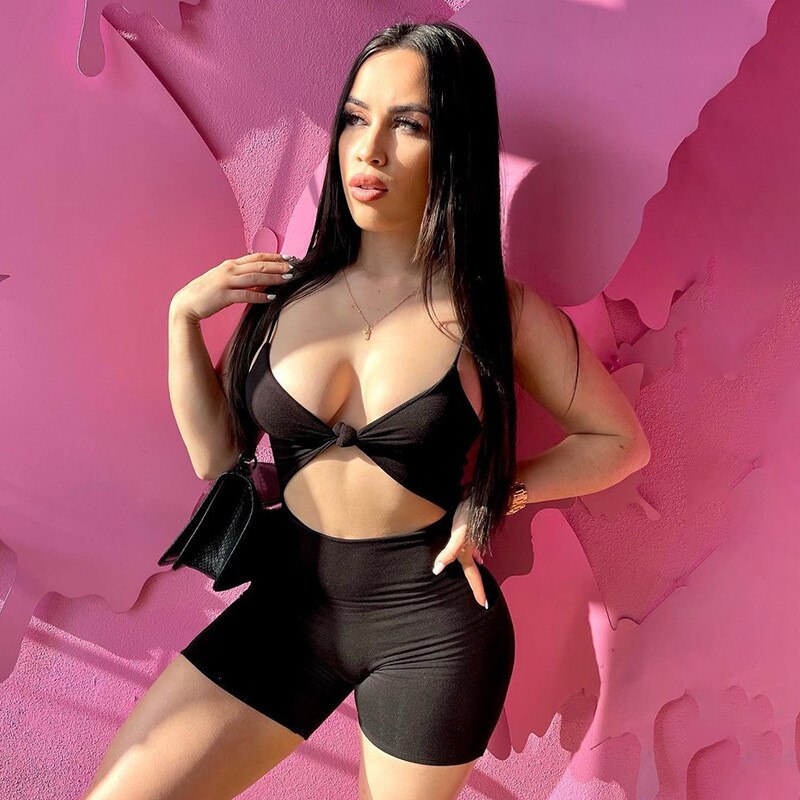 Jumpsuits Deep V-neck Hollow Out Clubwear 2021 Sexy Women Sleeveless Strap High Waist Bodycon Biker Shorts Playsuits