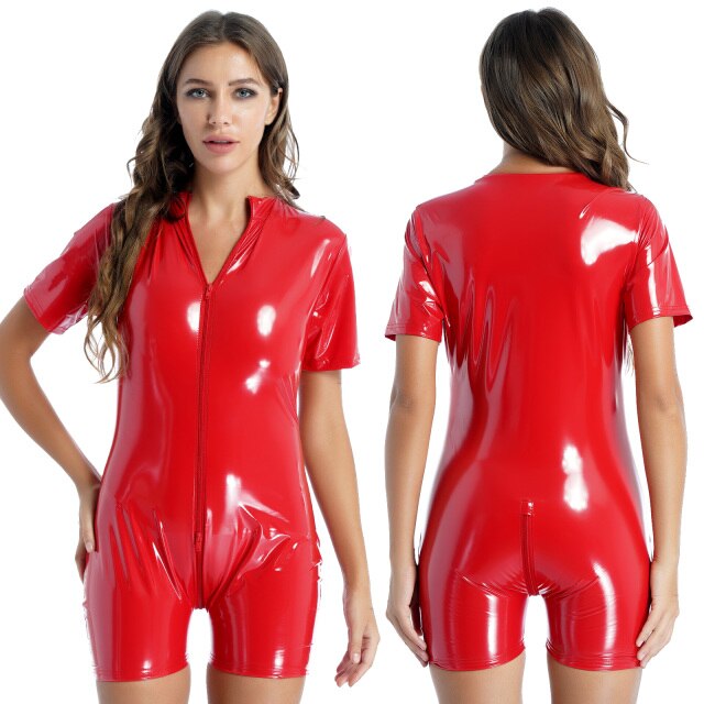 Women Two-way Zipper Patent Leather Bodysuit O Neck Short Sleeve Skinny Jumpsuits.