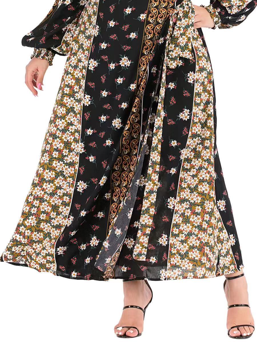 Dress Abaya Kaftan Women Large Size Lantern Sleeves Long Sleeves Printed Lace Stitching V-neck A-line Skirt Muslim Xl-5xl