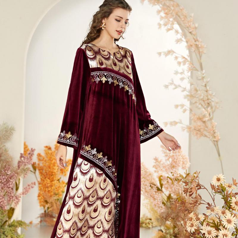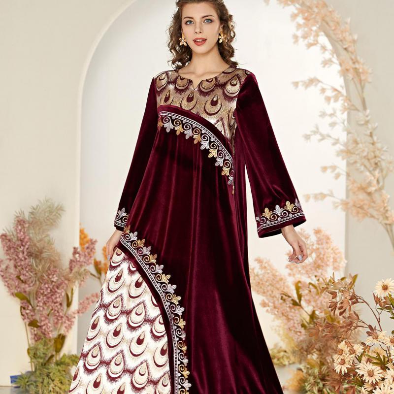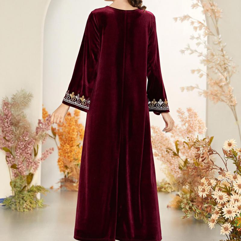 Fashion Arabian Gold Thread Embroidery Muslim Casual Jacquard Stitching Velvet Large Swing Dress Fashion Kaftan Islamic Clothing