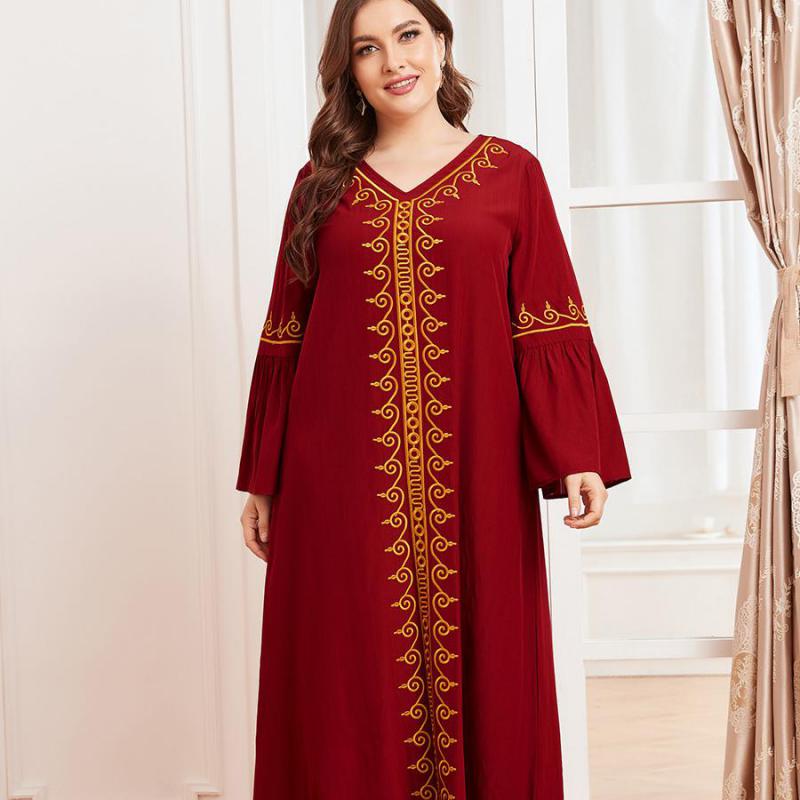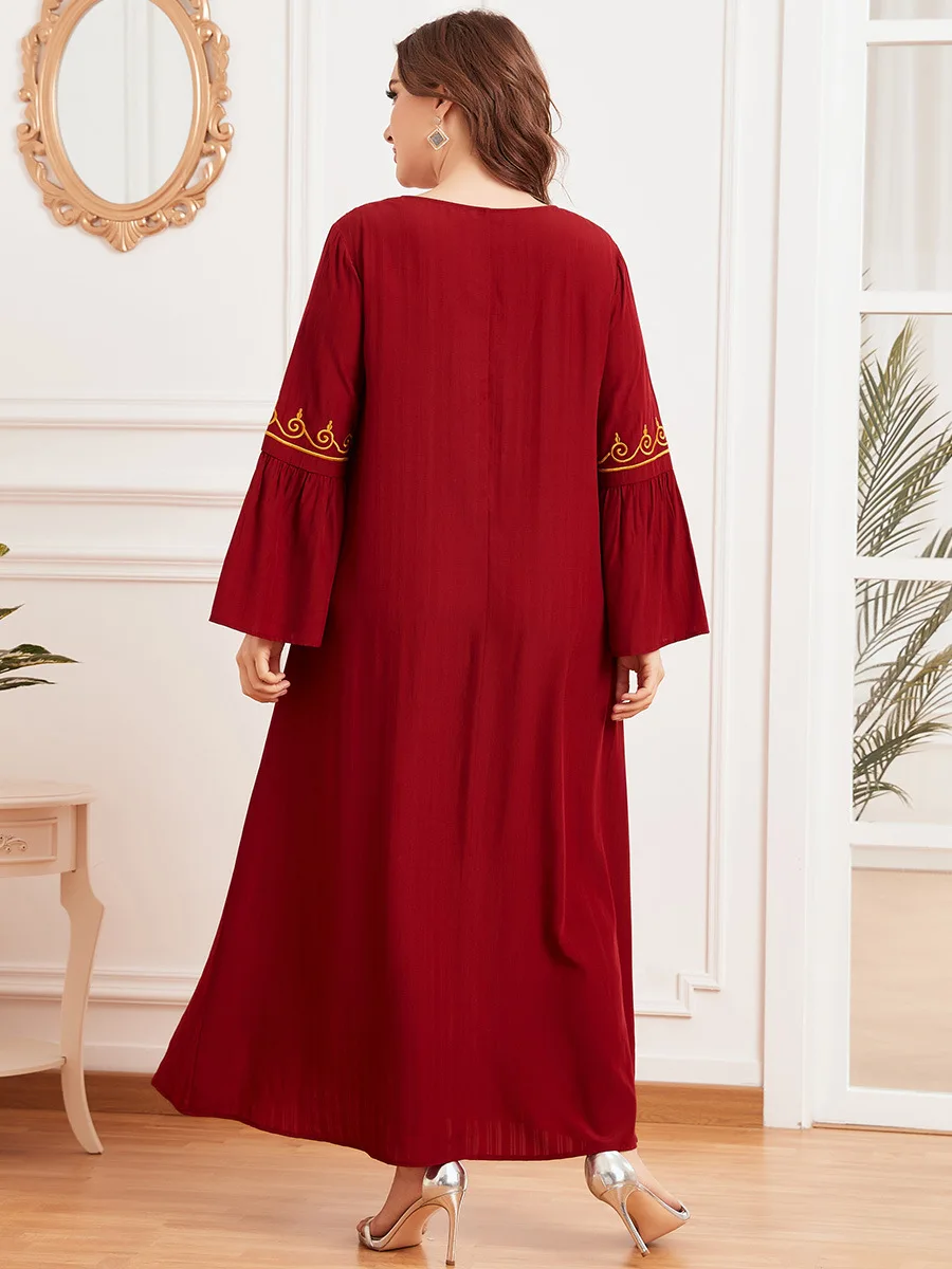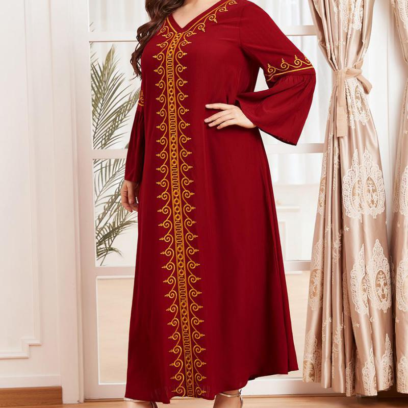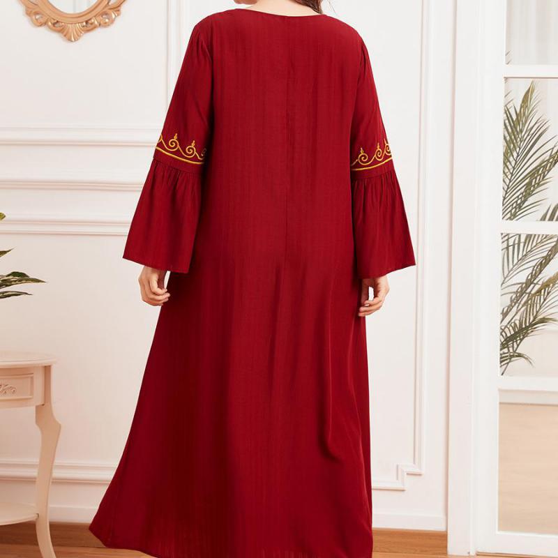 Muslim Oversized Women's Gold Thread Embroidery Long-sleeved Folds Retro Ethnic Red Temperament Long Skirt Djellaba 2021