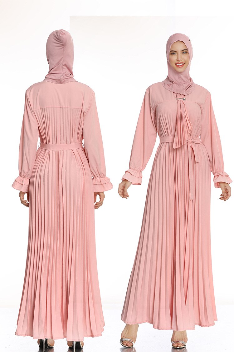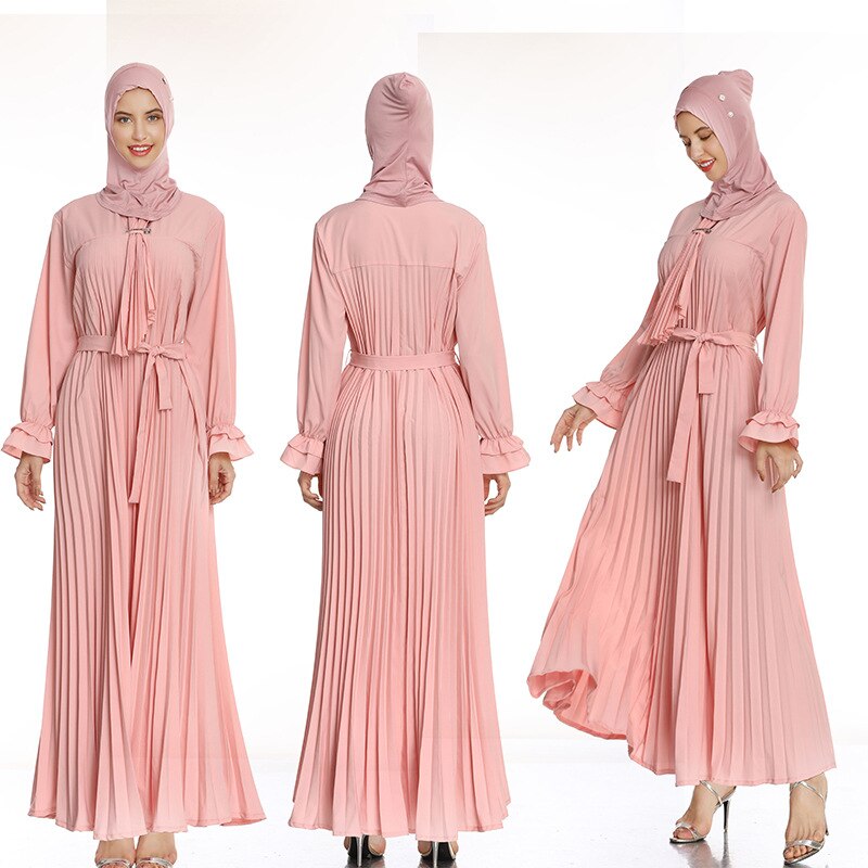 Pink 2021  Newest Muslim Abaya Pleated Sashes Elegant Ruffle Sleeve Abayas for Women Fashion Elegant A-line Islamic Dress