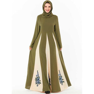 Abaya Arab Plus Size Women's Green Embroidery Stitching Contrast Color Muslim Long Skirt With Turban Muslim Dress Women