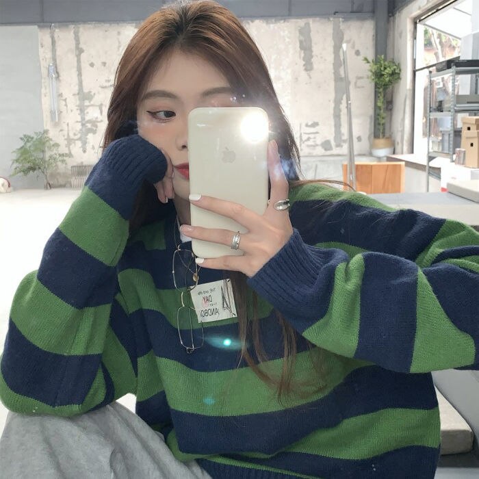 Autumn and Winter Striped Sweater Female Student Korean Version Loose College Style Contrast Long-sleeved Sweater Jacket
