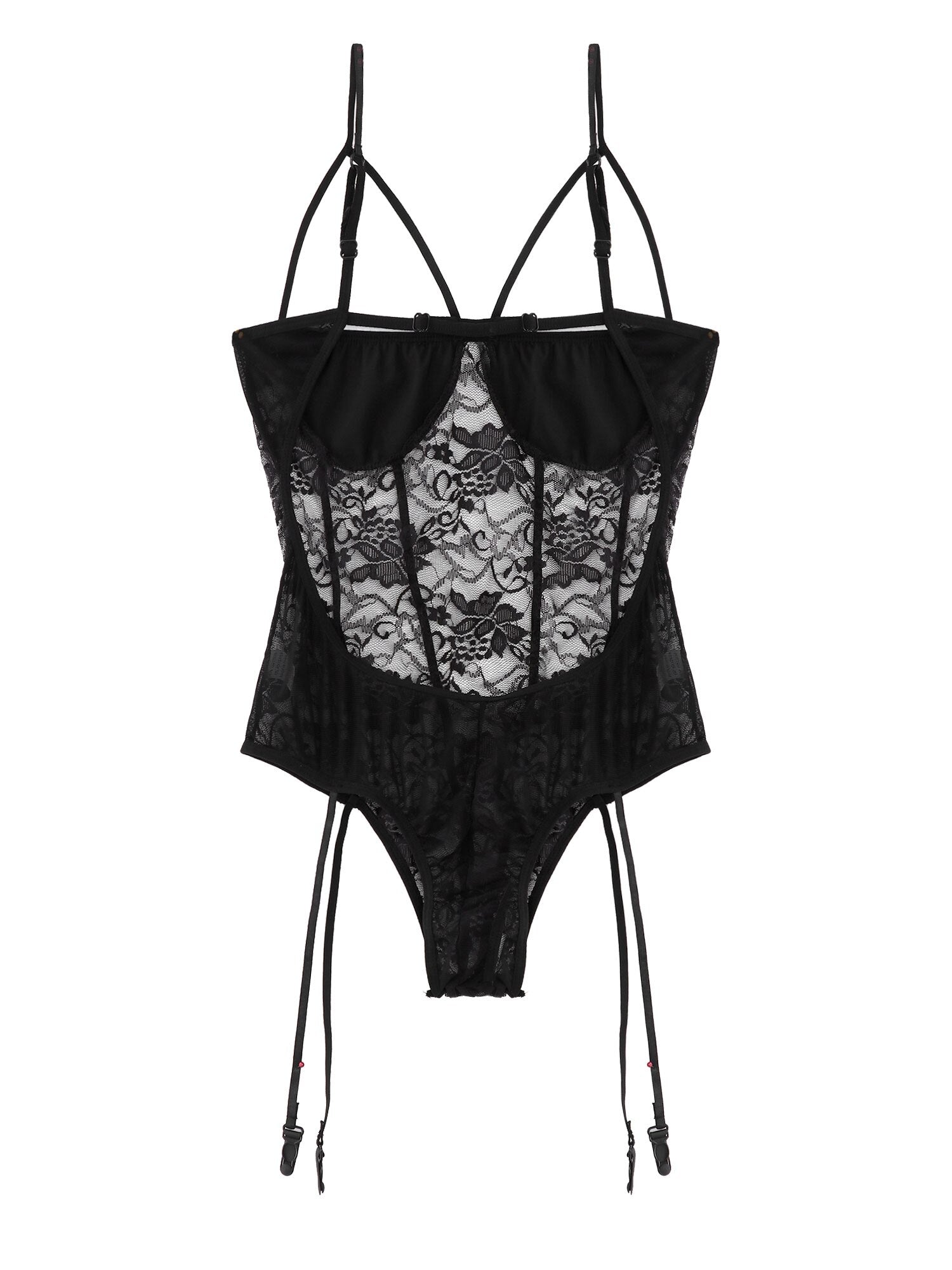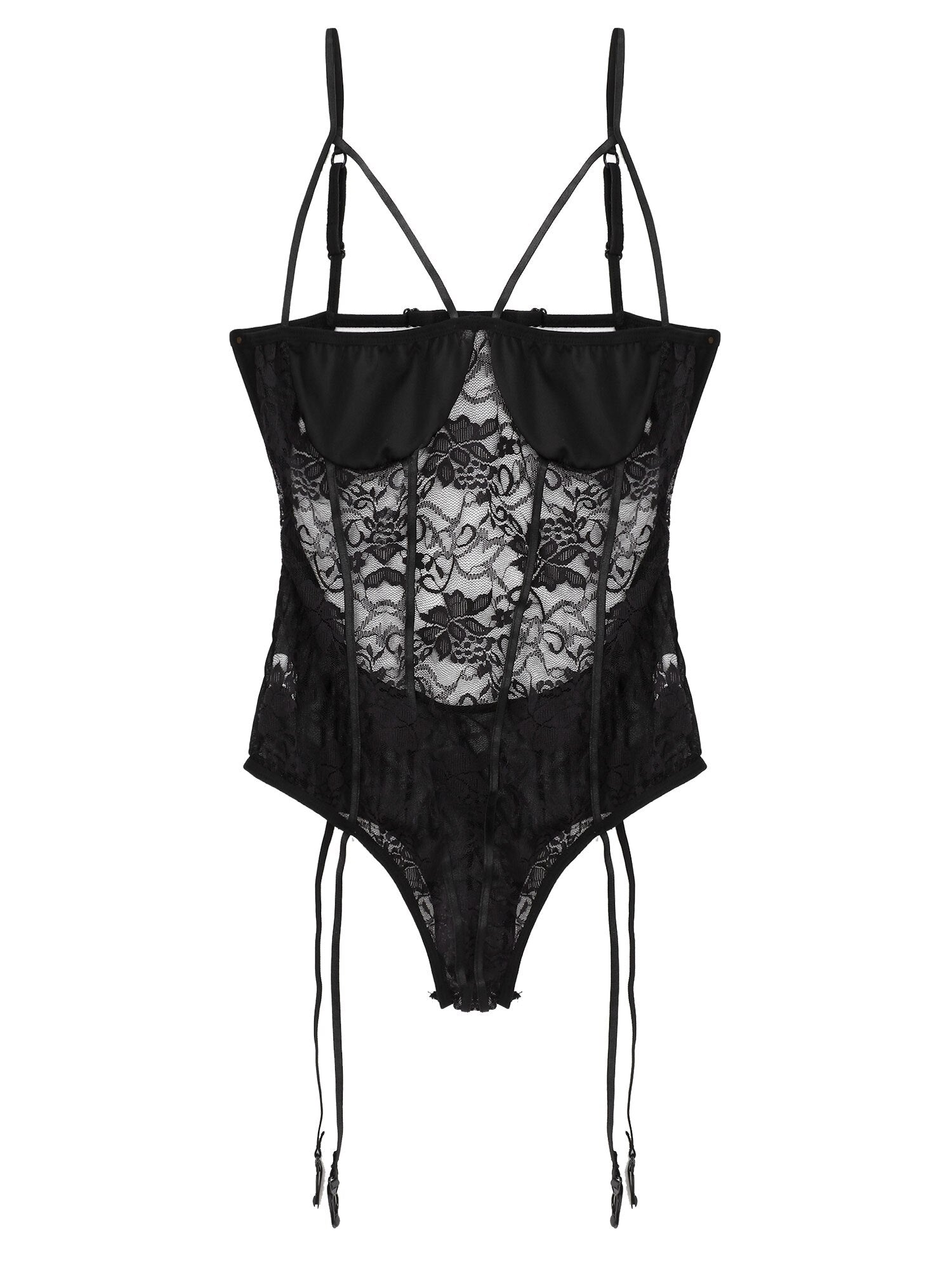Women Plus Size Adjustable Spaghetti Straps Open Bras See-through Lace Open Back Jumpsuit Underwear.