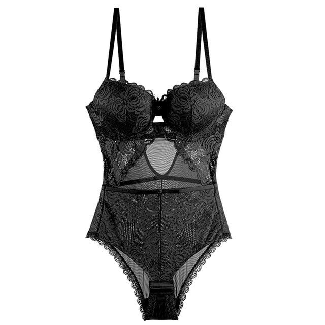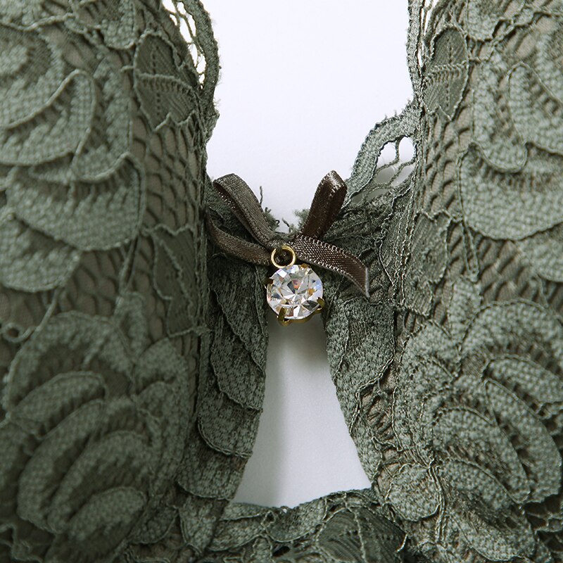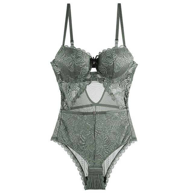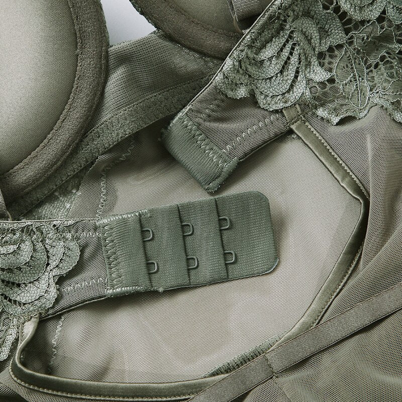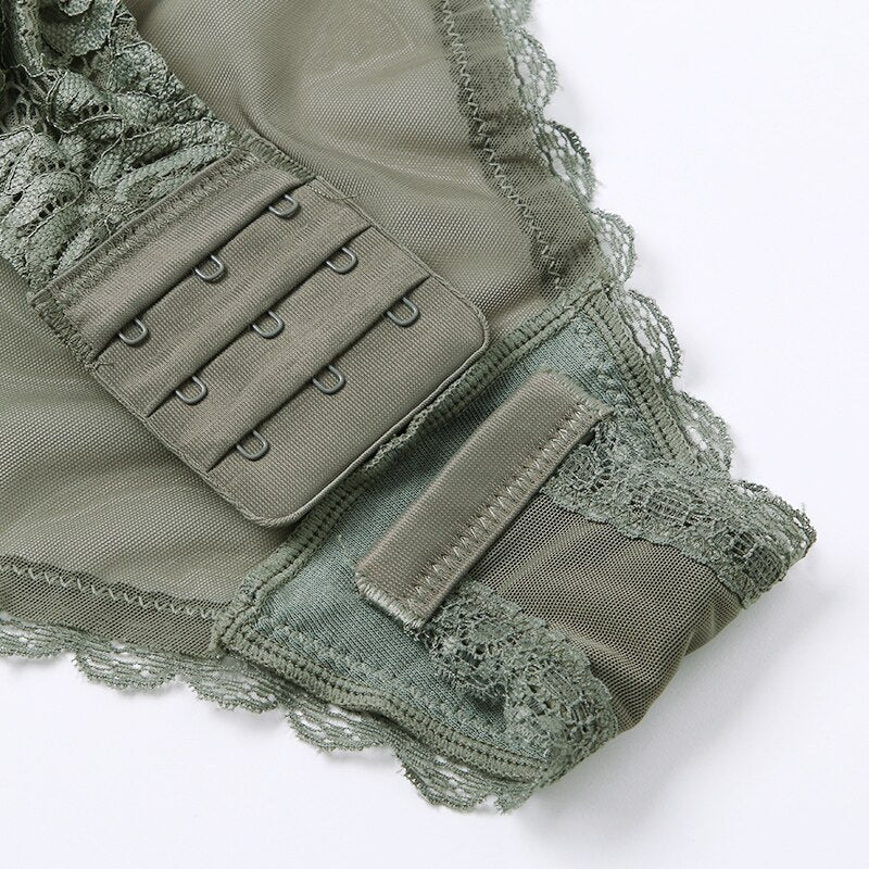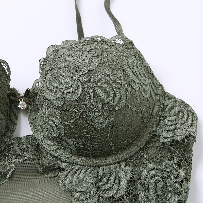 Body Women Sexy Lingerie Push Up Bodysuit Padded Cup Underwire Floral Pattern Army Green Bra and Brief Set High Cut Underwear