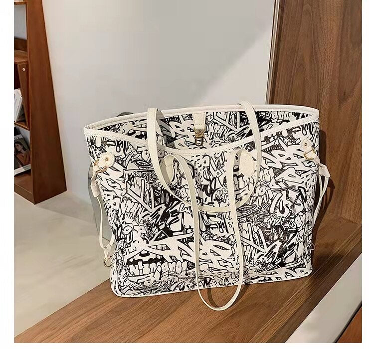 Bolsa tote feminina com estampa de desenho, bolsa de mão de couro pu de alta capacidade, bolsa de ombro para compras