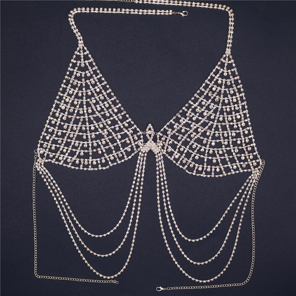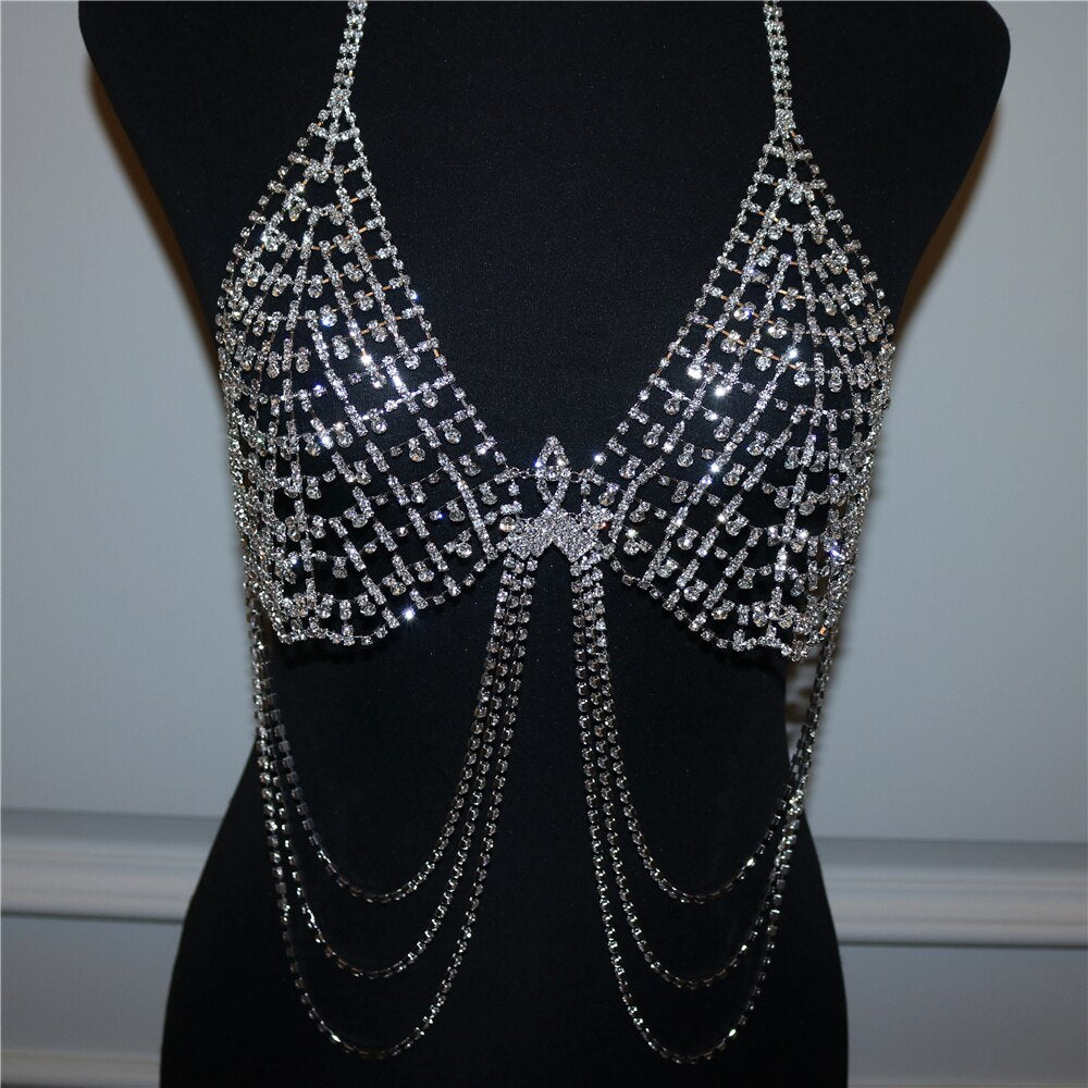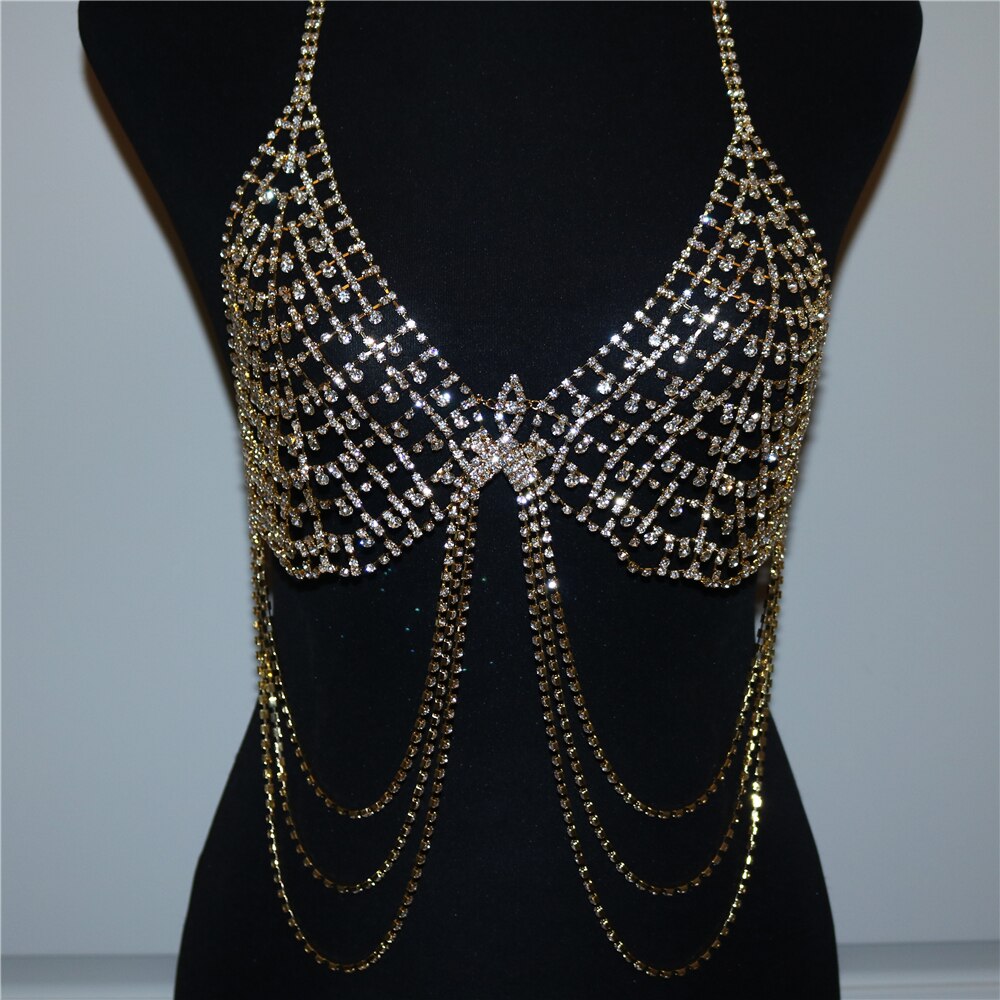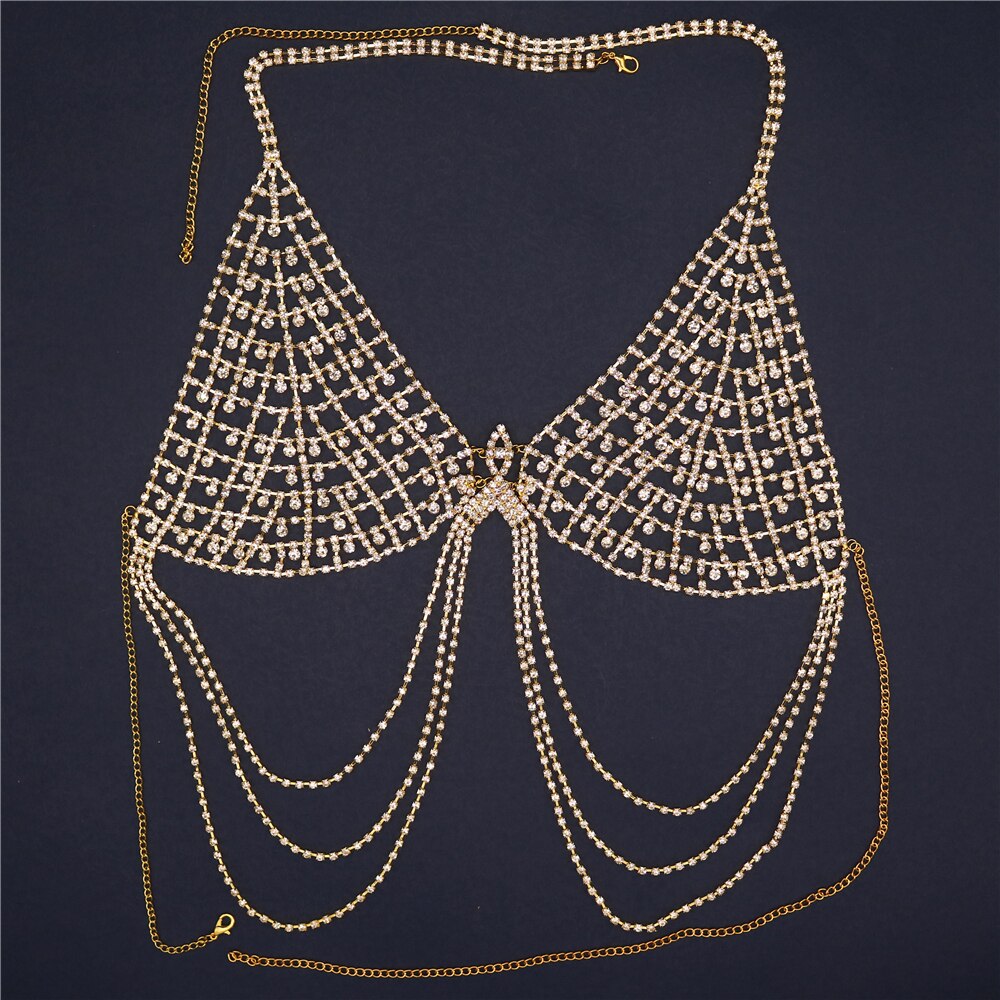 Bright rhinestone body chain jewelry for women sexy adjustable crystal tassel bra chain bikini lingerie nightclub party jewelry