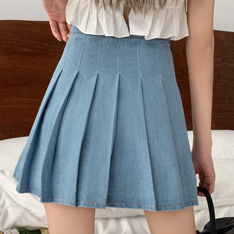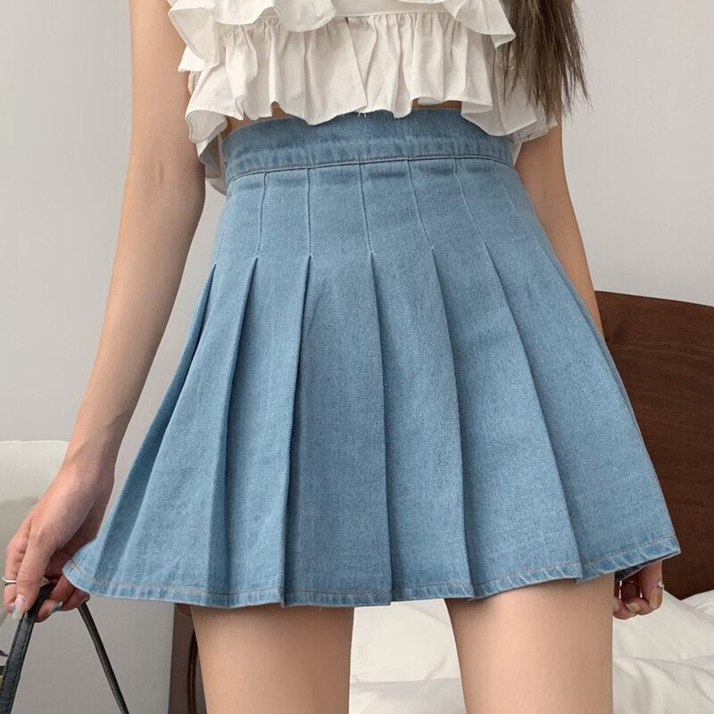 Casual Women Solid Denim Mini Sexy A-Line Pleated Skirt Summer Korean Kawaii Harajuku High Waist Short Skirts Female