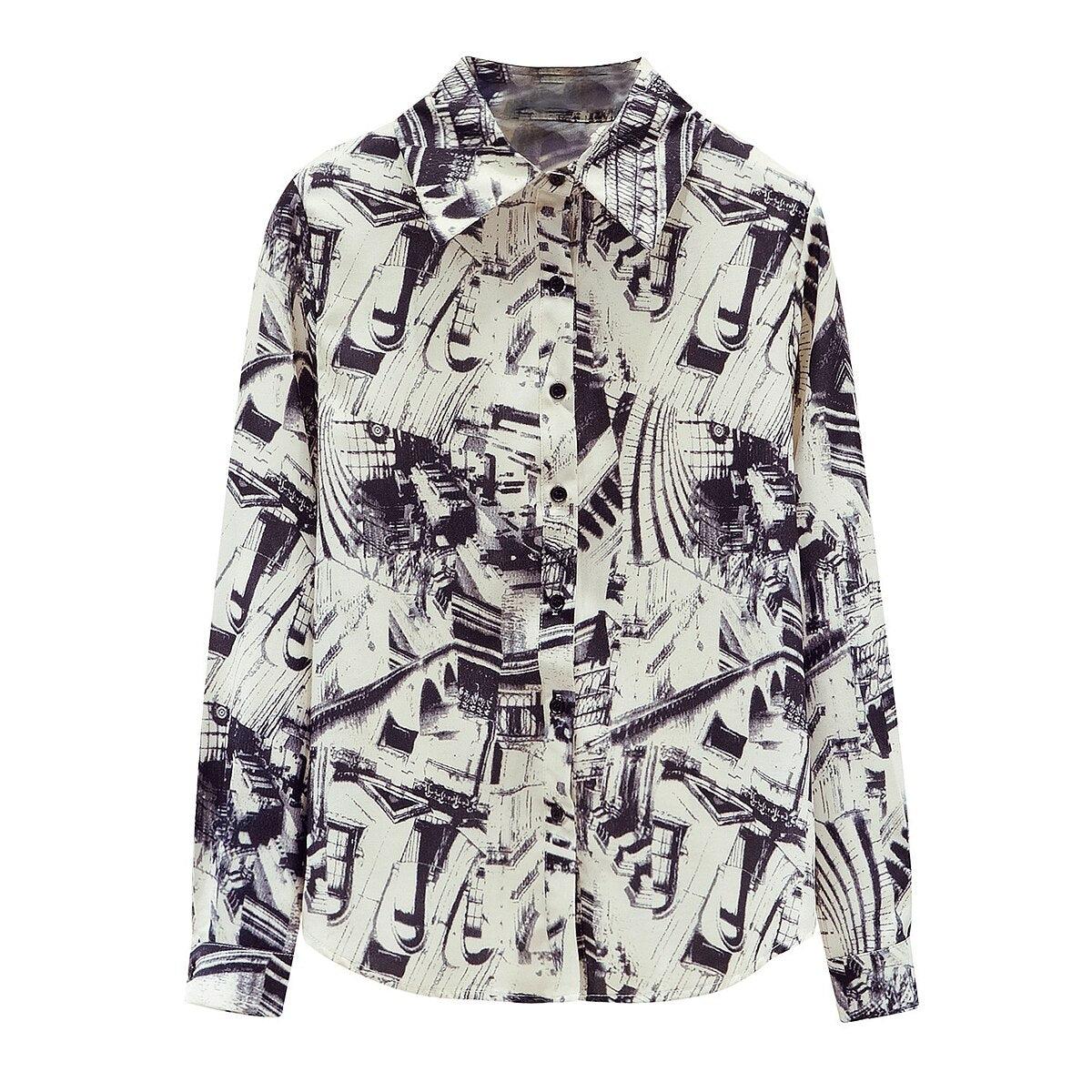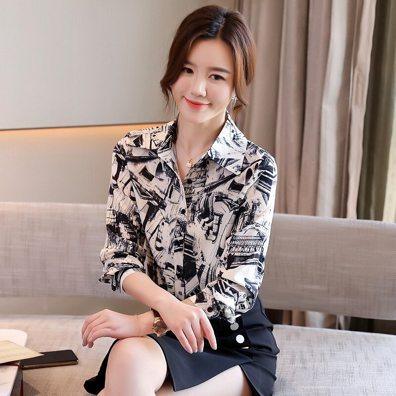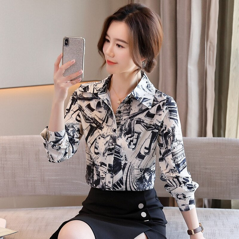 Chiffon Shirt New 2021 Spring Autumn Long Sleeve Ink Print Women Blouse Elegant Slim Office Lady Tops Loose Clothing