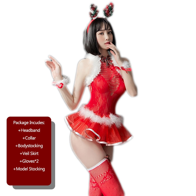 Christmas Cosplay Costumes Temptation Elk Headband Hollow out Outfit Sexy Lingerie For Women Bra Set Red Fishnet Bodysuit<;br/><;br/>Package Incudes: <;br/><;br/>+Headband +Collar +Bodystocking +Veil Skirt +Gloves*2 +Model Stocking <;br/><;br/>Size :One Size <;br/><;br/>Fits For Weight: 40-65KG <;br/><;br/>Reference Size Model Weight: 50kg Height: 168cm