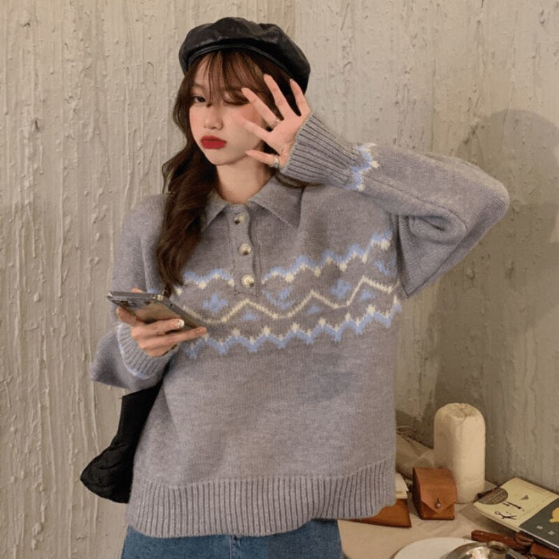 College Style Retro POLO Collar Pullover Jacquard Sweater Female Student Korean Version Loose Knit Sweater Coat Jacket
