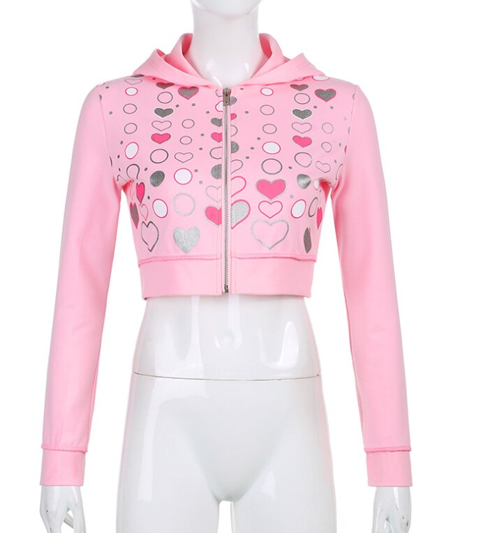 Cute Heart Printed Cropped Hoodie Women Autumn Harajuku Pink Zip Up Hooded Swearshirt Girls Cotton Soft Streetwear 2022 New