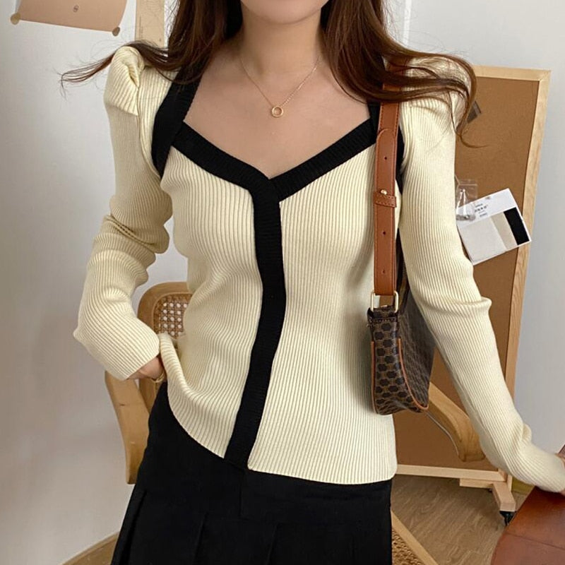 Elegant Square Collar Puff Sleeve Knitted Cardigans Women Slim Fit Skinny Sweater Coat Korean Style Autumn Winter Pull Femme