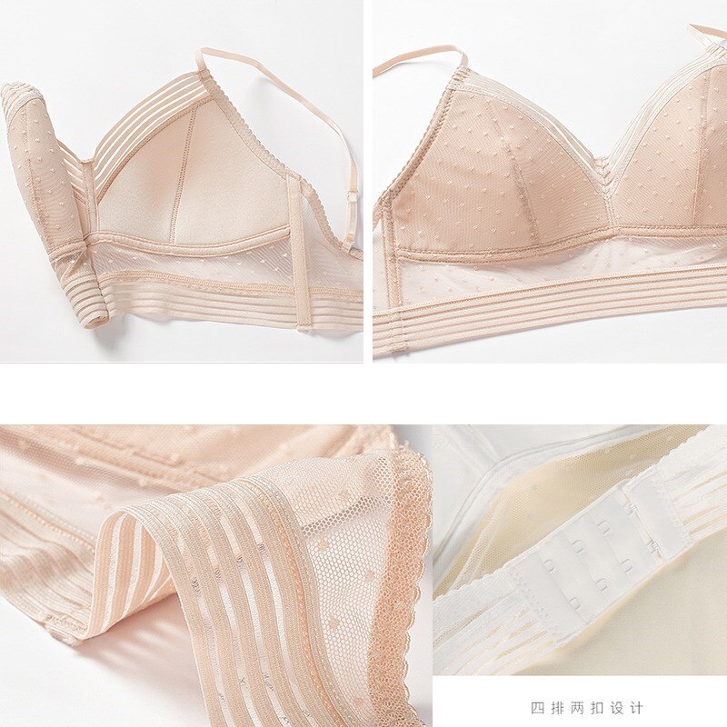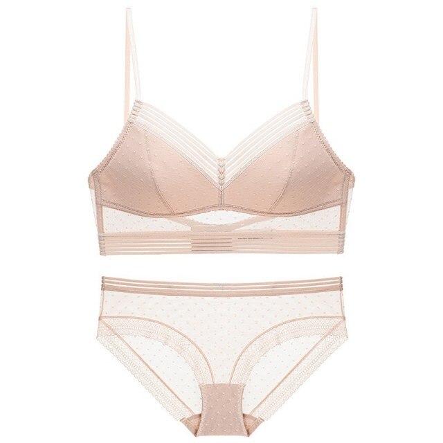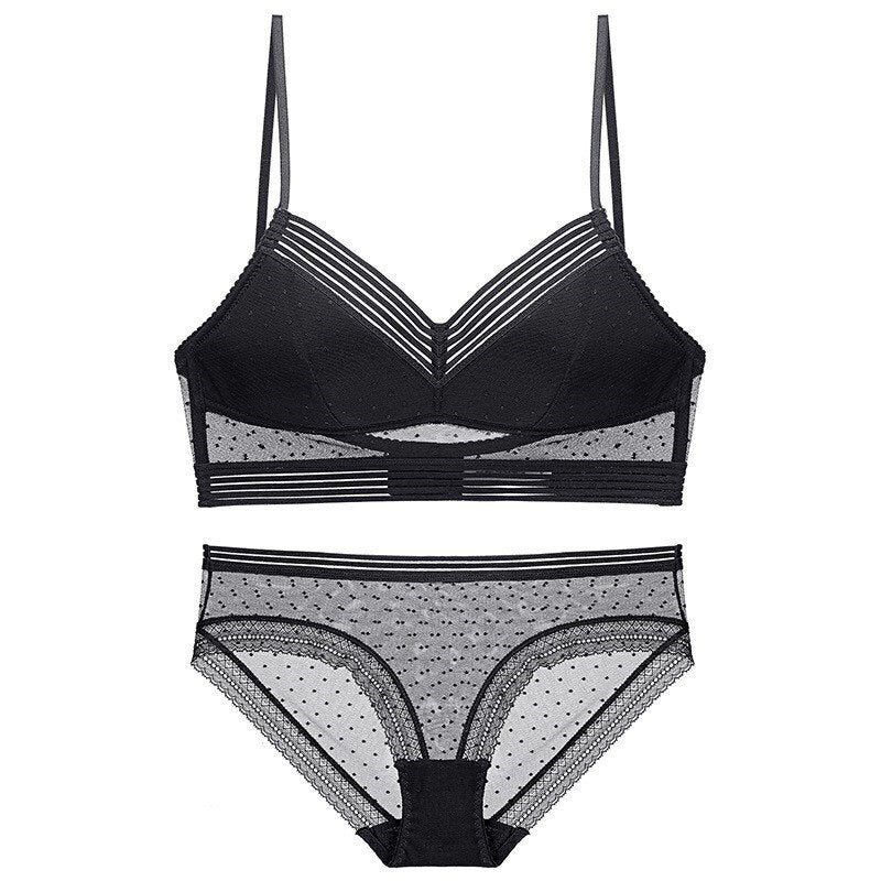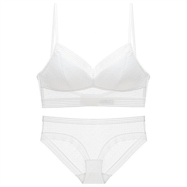 French Sexy Polka Dot Lace Bra Set Women Deep V-Neck Thin Push Up Underwear Backless Top Women Transparent Panties Lingerie Set