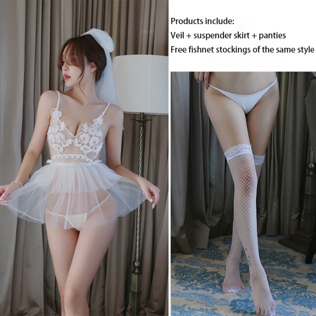 The product contains: veil + suspender skirt + panties + the same type of fishnet stockings