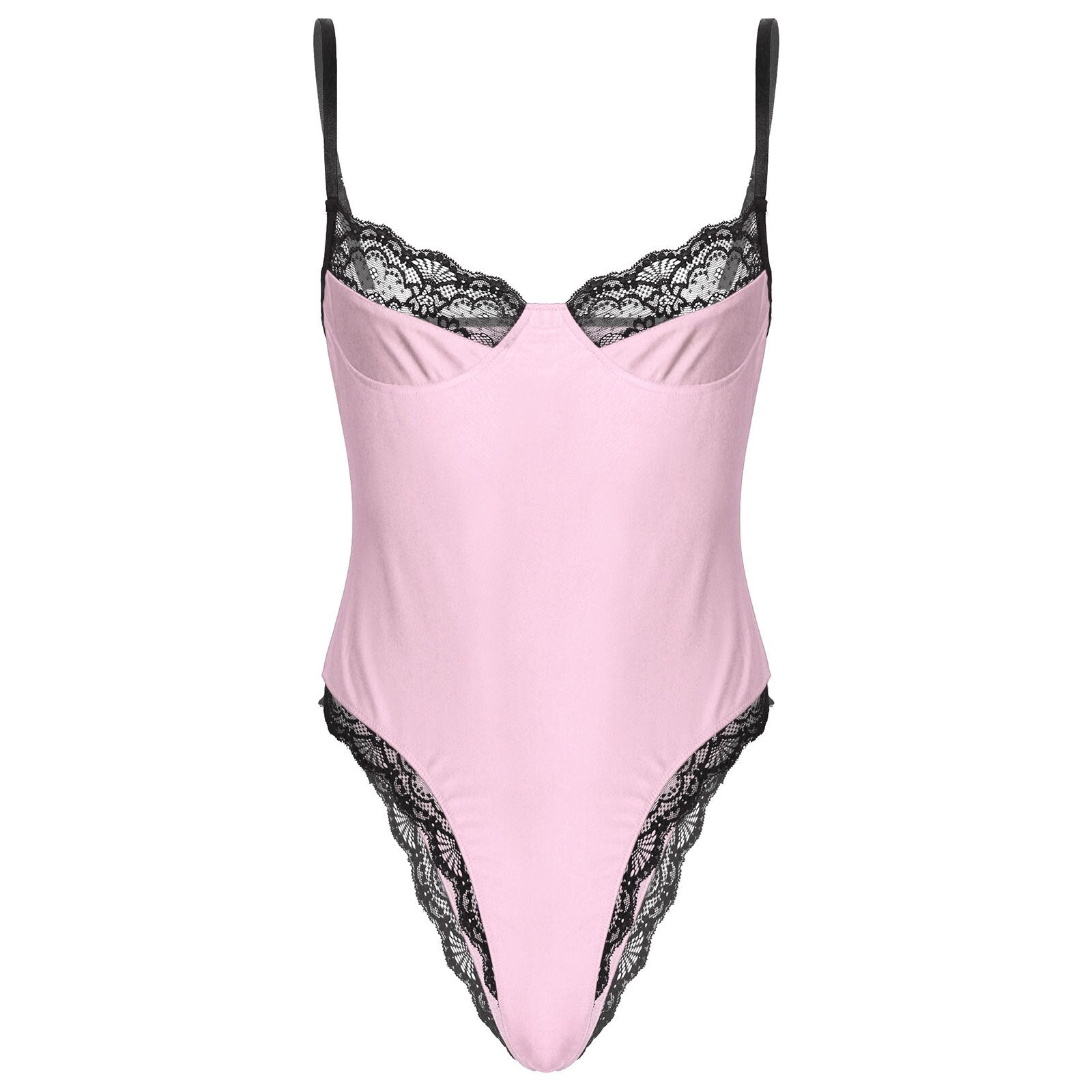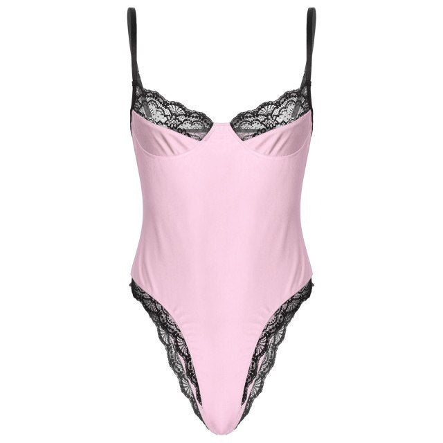 Men Lace Trimming Bodycon Bodysuit Sissy Unlined Wireless Bra Leotard.