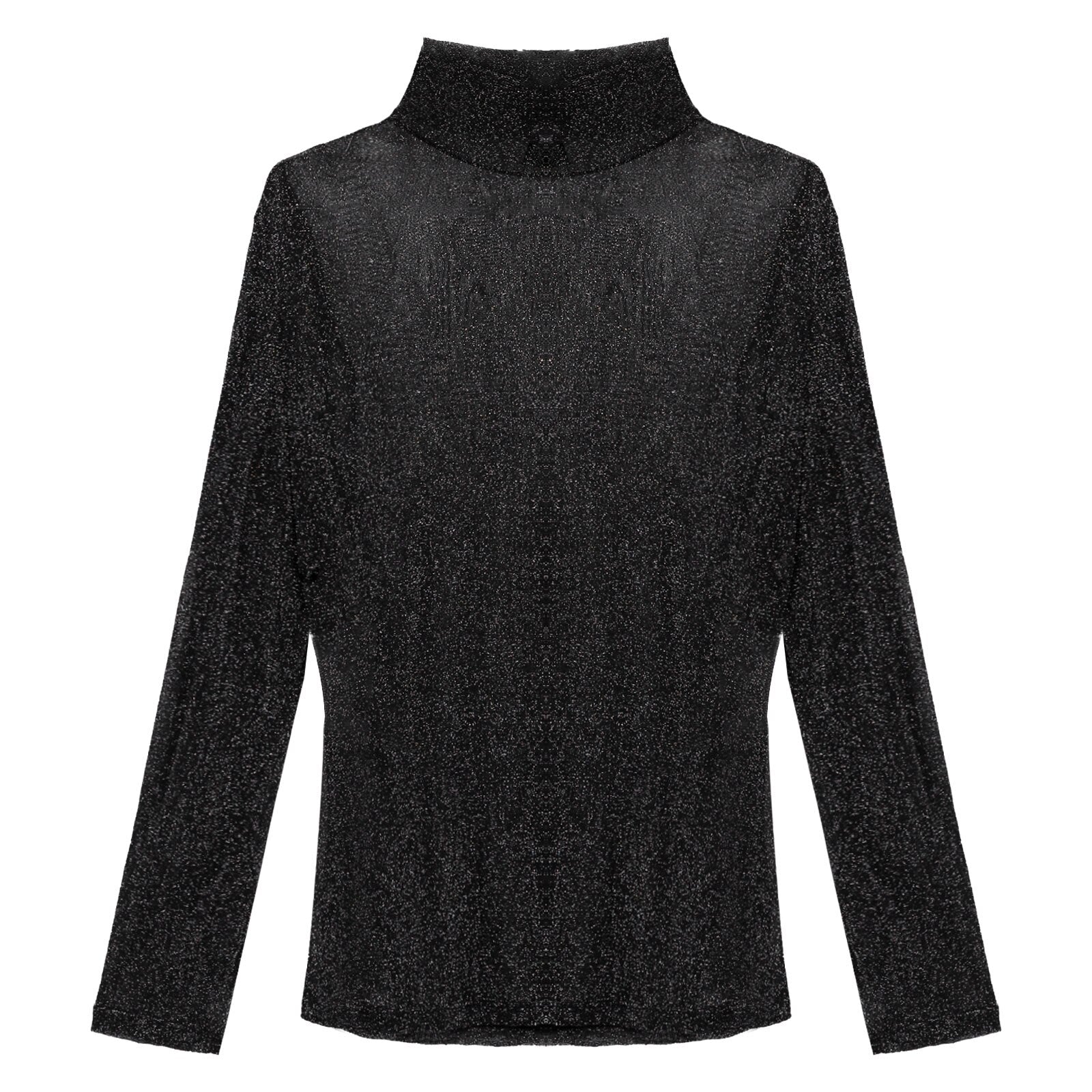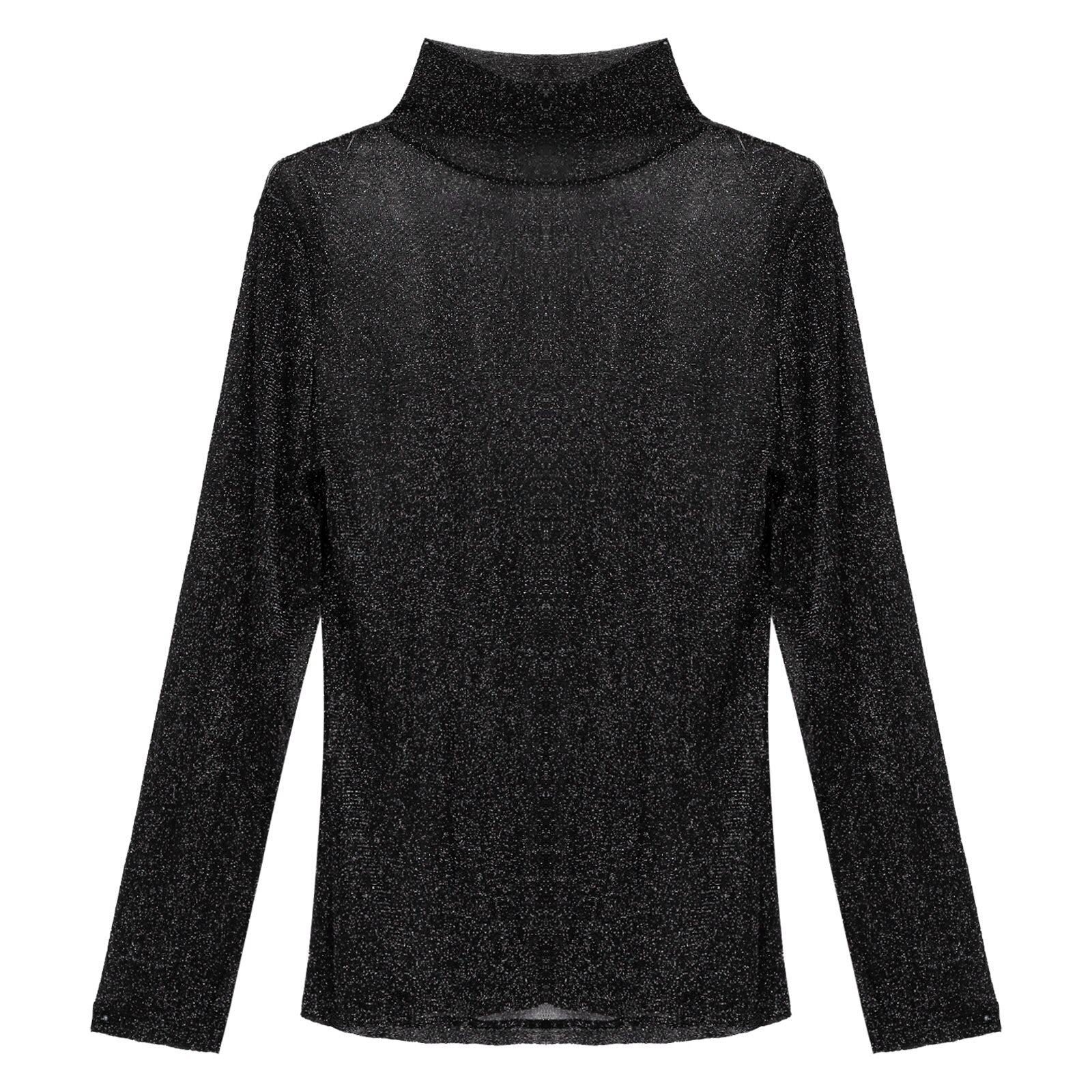 High neck, long sleeve, shiny see-through T-shirt, great match with jeans, flared pants.