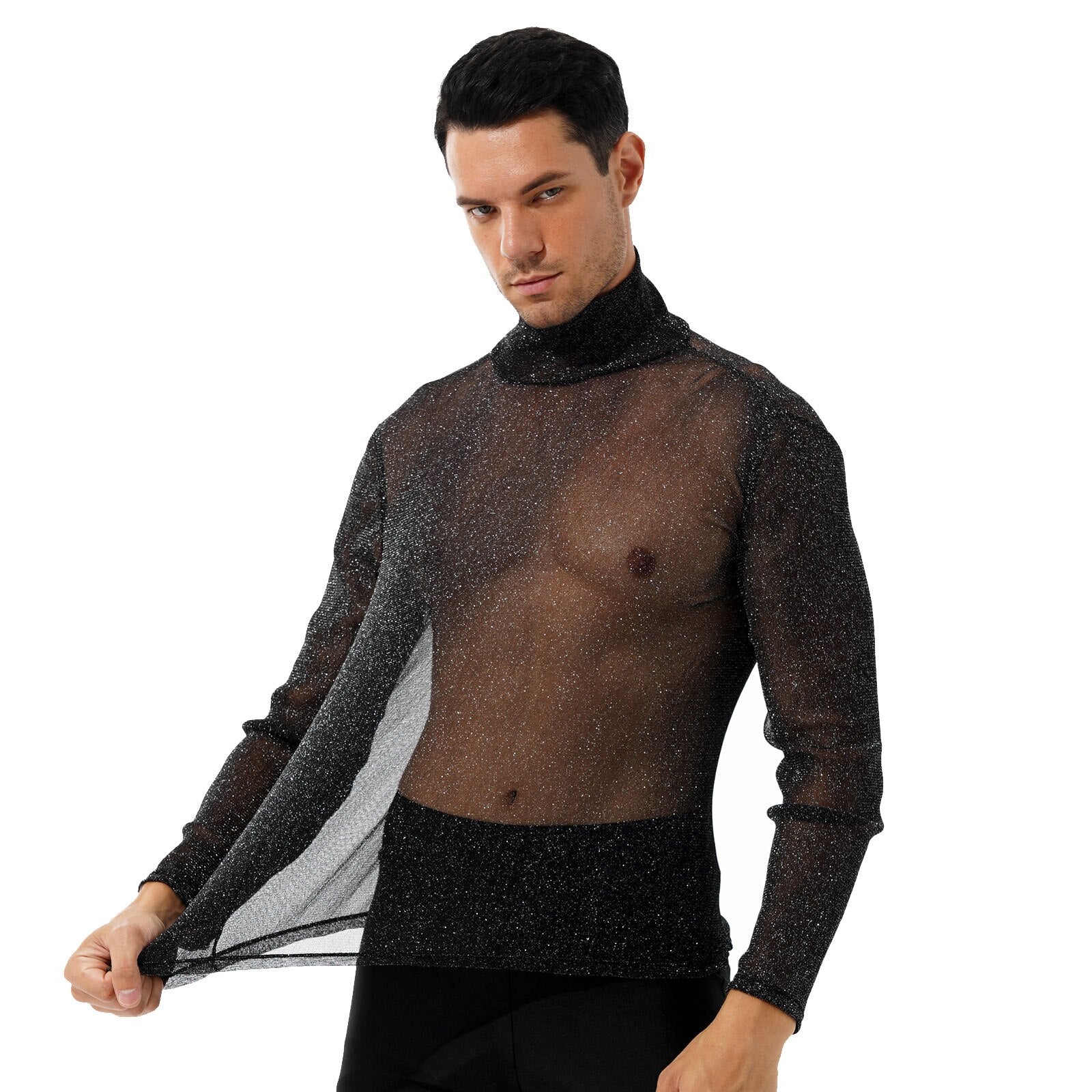 Men Fashion Shiny See-through T-shirt High Neck Long Sleeve Tops Streetwear for Party Nightclub Music Concert.