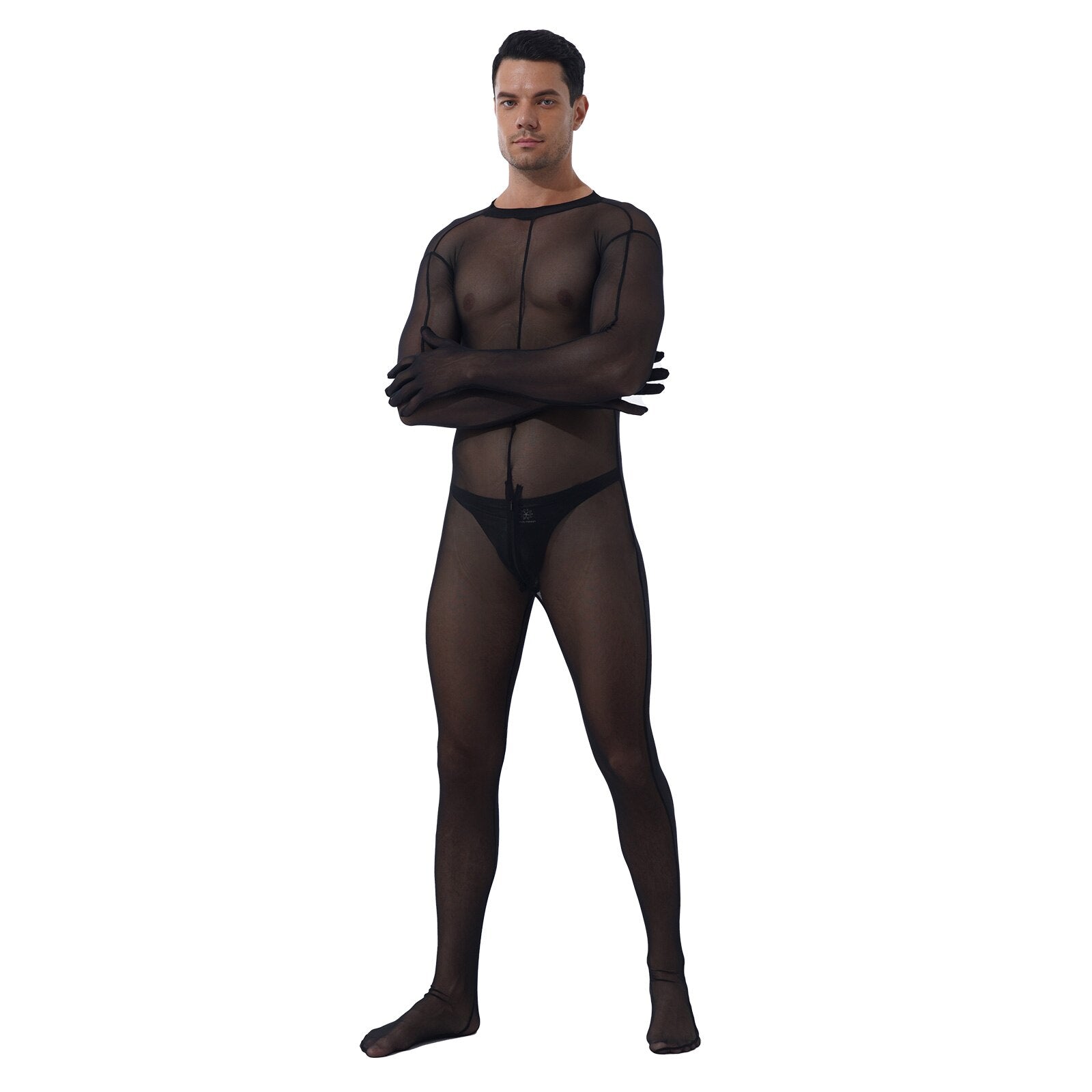 Sheer full body design, long sleeve, zipper closure in back and crotch. Match with a patent leather bulge pouch.
