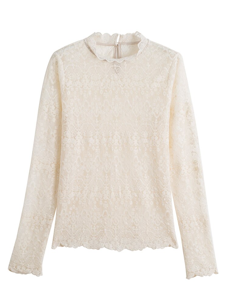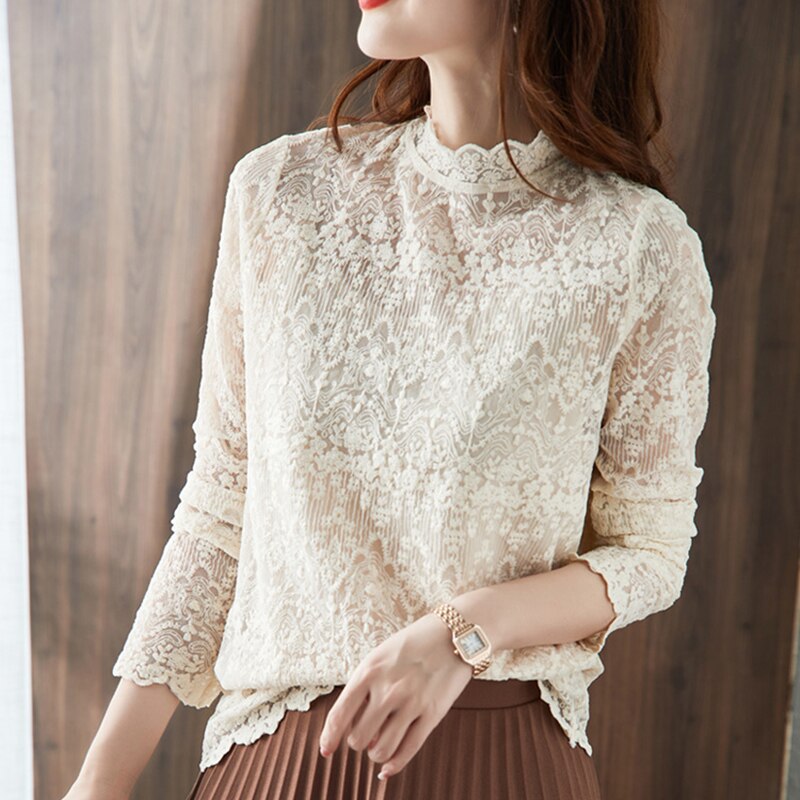 New 2021 Autumn Thin Stand Collar Lace Tops Fashion Casual Long Sleeve Hollow Out Women Blouse Shirt 3XL