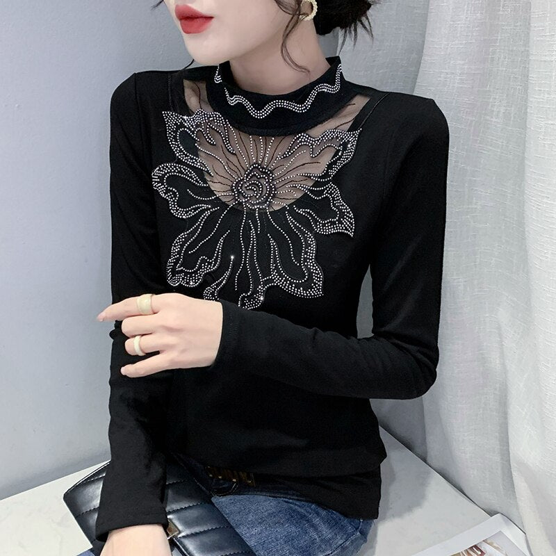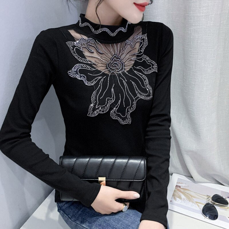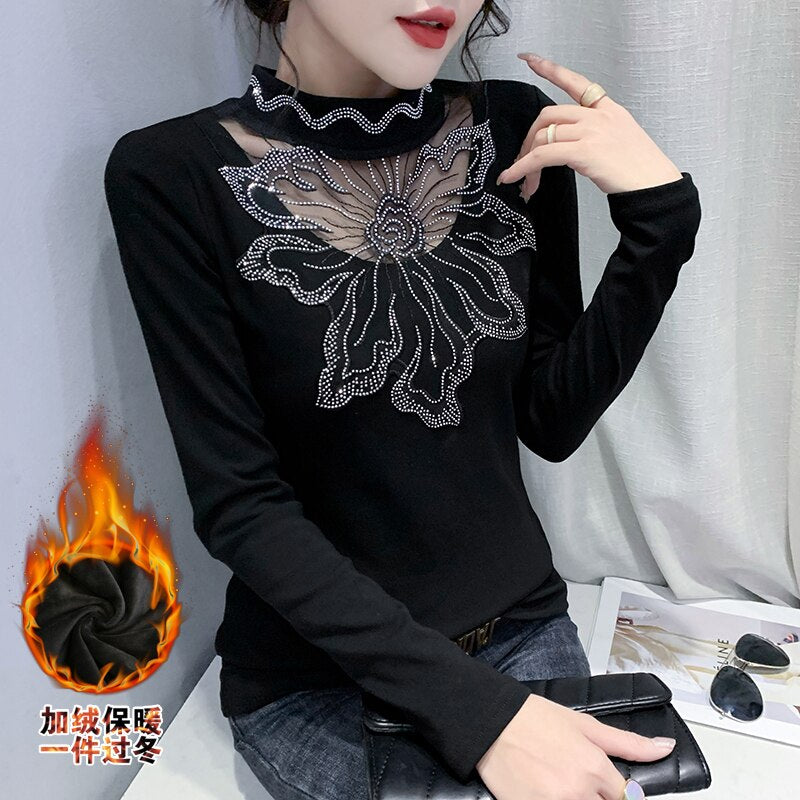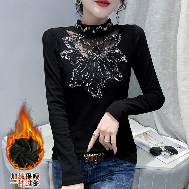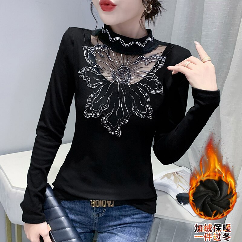 New 2021 Autumn Winter Velvet Warm Women T-Shirt Fashion Long Sleeved Bottoming Shirt Stitching Hot Drilling Black Tops