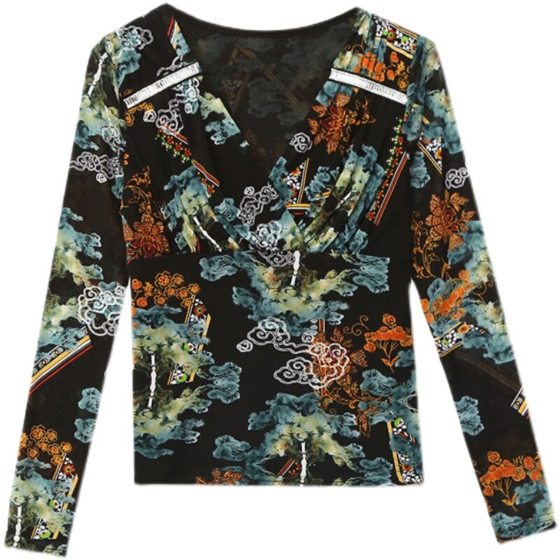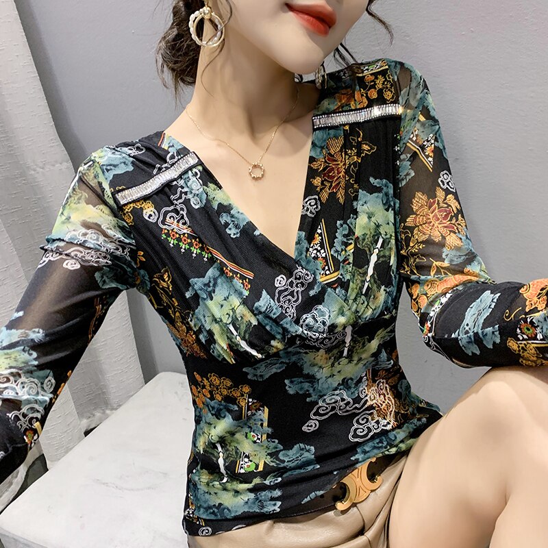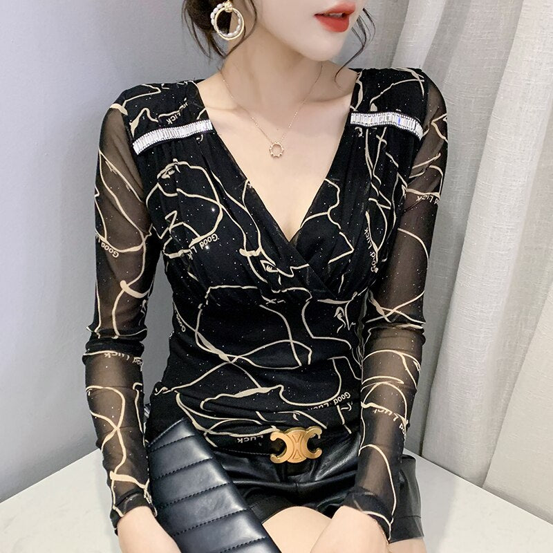 New 2021 Autumn Women Clothing Fashion Sexy V-Neck Print Mesh Tops Elegant Slim Women's T-Shirt