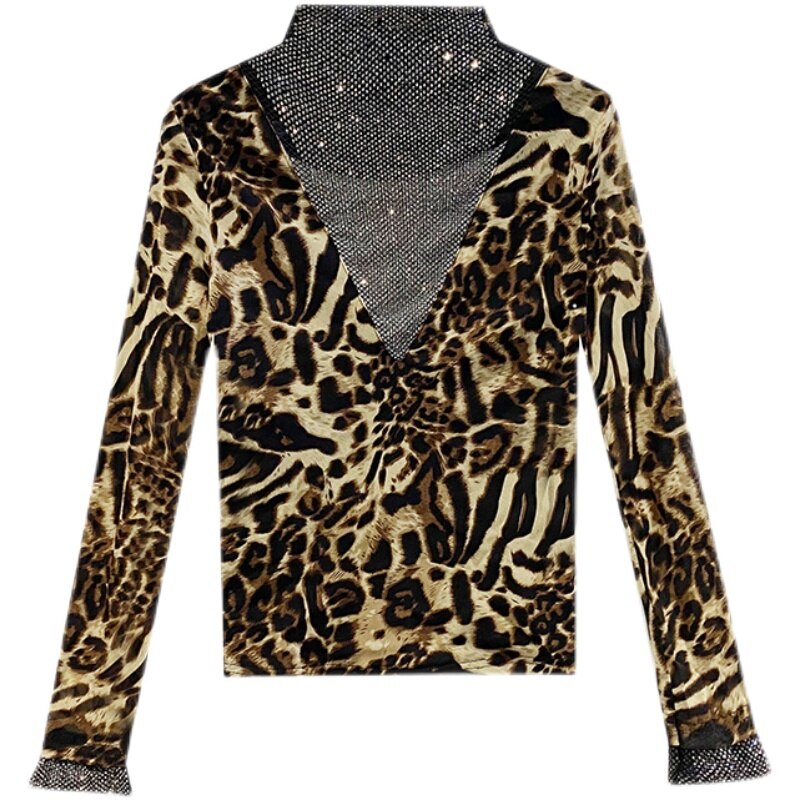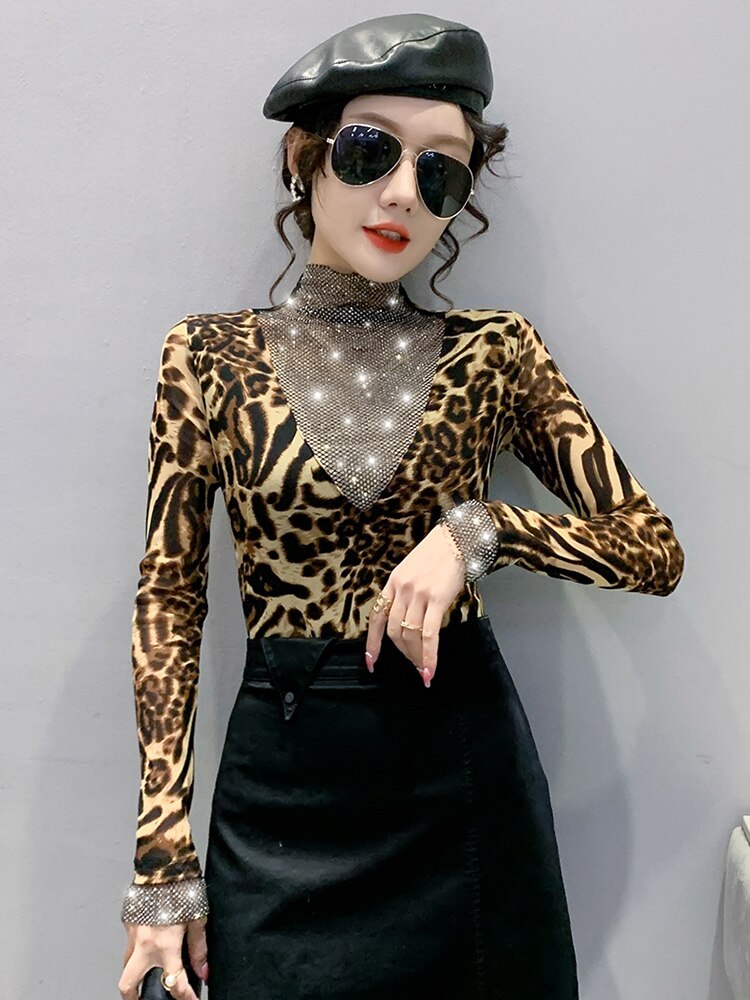 New 2021 Autumn Women's T-Shirt Fashion Casual Long Sleeved Turtleneck Hollow Out Mesh Tops Elegant Slim Leopard Women Clothing