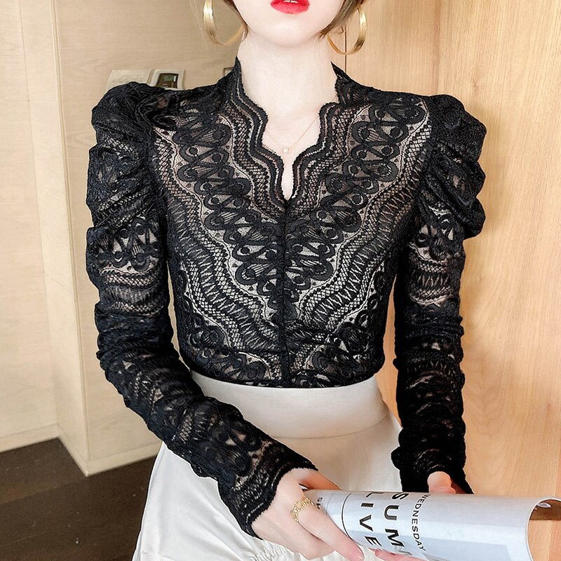 New 2021 Spring Women Blouse Shirt Fashion Elegant Slim V-Neck Lace Tops And Shirt Solid Color Hollow Out Female Shirt