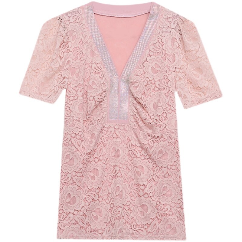 New 2021 Summer Short Sleeve Lace T-Shirt Fashion Casual Sexy V-Neck Women's Tops Elegant Slim Lady's Shirt Blusas