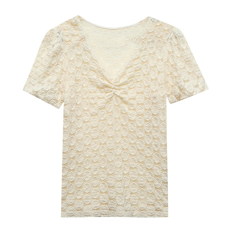 New 2021 Summer Short Sleeve Lace Tops Fashion Sexy V-Neck Women's T-Shirt Elegant Slim Hollow Out Female Blusas