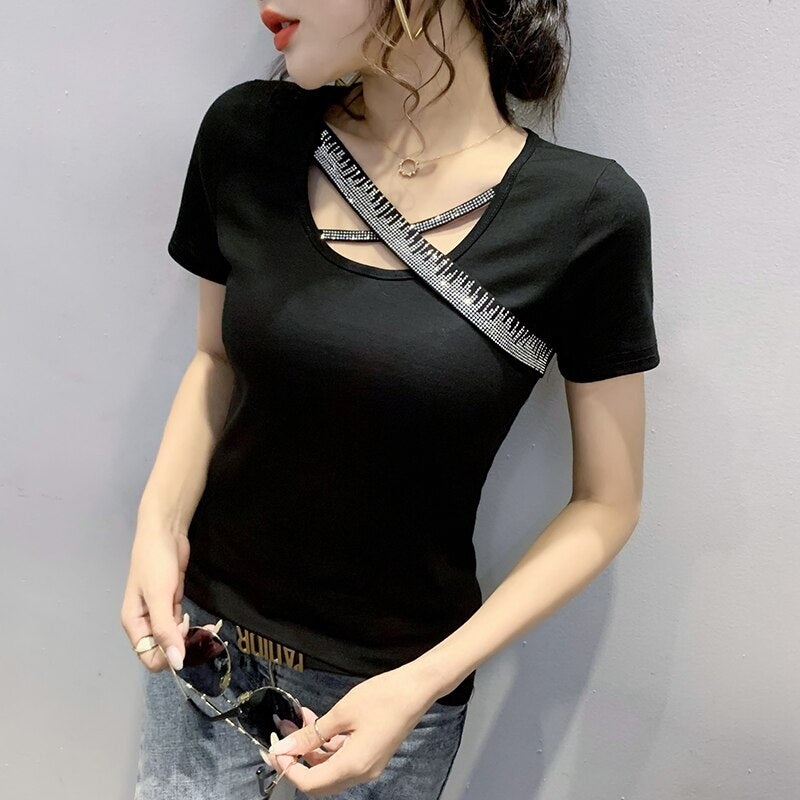 New 2021 Summer Short Sleeve Women's tshirt Fashion Casual Hot drilling Tops And Shirt Sexy V-Neck Female Blusas