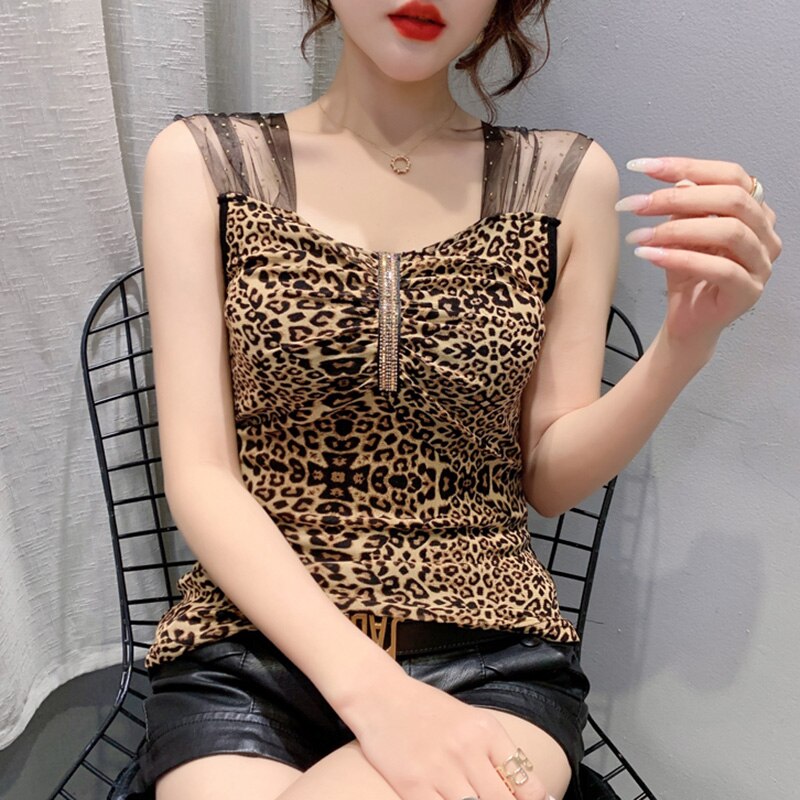 NEW 2021 Summer Sleeveless Mesh Tops Shirt Fashion Casual Leopard hot diamond Women's T-Shirt
