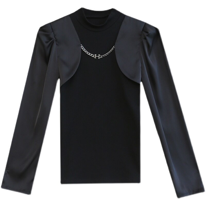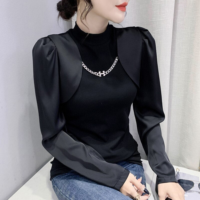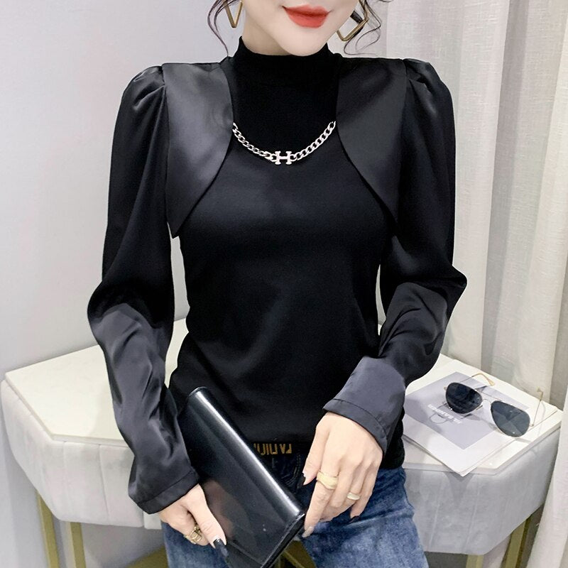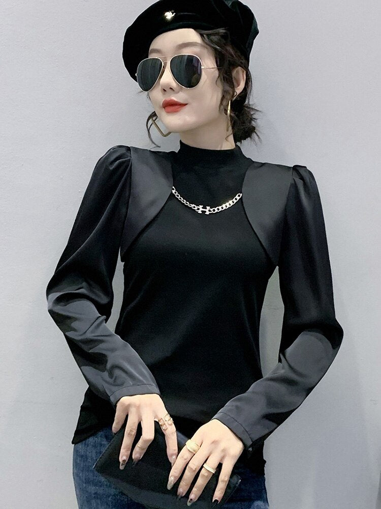 New 2022 Spring Women's T-Shirt Fashion Casual Long Sleeved Turtleneck Ruffles Shirt Elegant Slim Black Ladys Tops Blusas