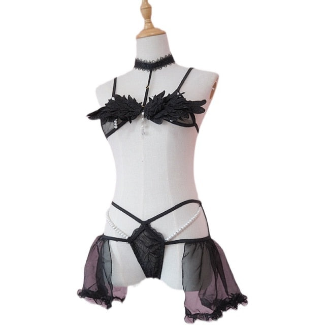 New Sexy Lingerie Angel Wings Hanging Neck Underwear Set Water Soluble Flower Embroidered Wings Seduction Cosplay Devil Uniform