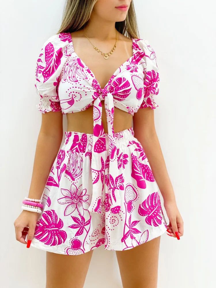 New Women's Lace-up Bubble Sleeve Short Sleeve Printing Suit Shorts Two-piece V-neck Blouse Women Sweat Suit Set Female set
