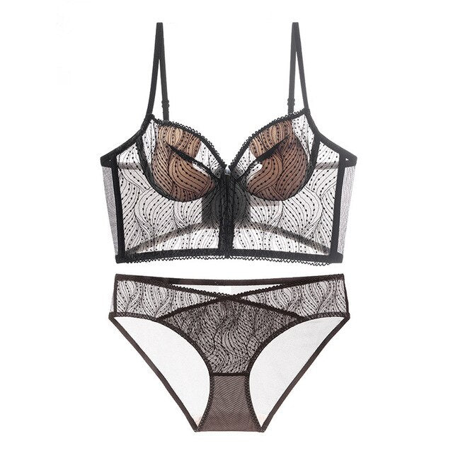 New Women Underwear Sexy Transparent Lace Bra Set Summer Thin Cup Ultra Wide Tops Fashion Deep V Hollow Body Shaper Lingerie