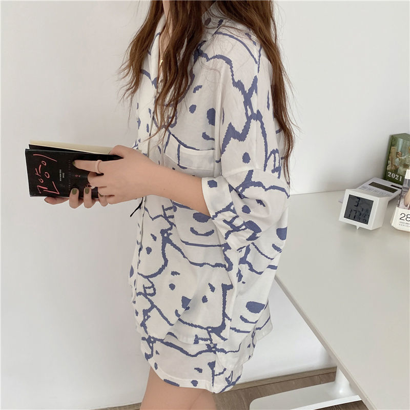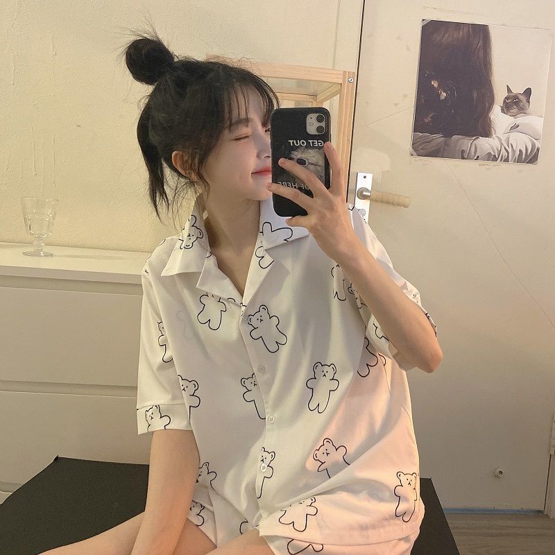 Pajamas Women Summer Bear Print Thin Can Be Worn Outside Cardigan Home Service Suit Two-Piece Set  Japanese Style Kawaii