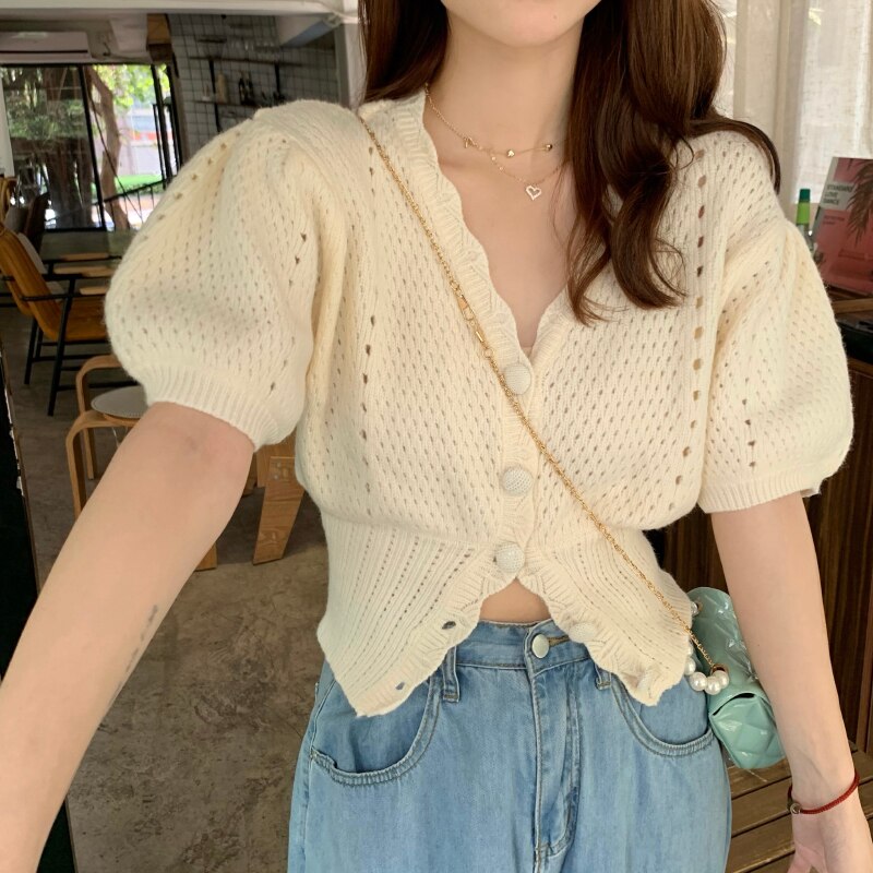 Puff Sleeve Sweater Women's New Design V-neck Thin Cardigan Hot Girl Style Short Knit Tops Women Elegant Sweet Hipster Sueter