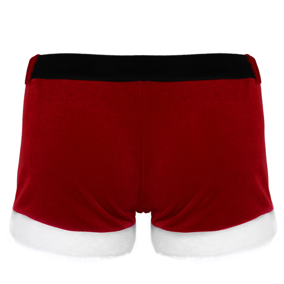 Comfy wide elastic waistband with belt loop, front with bulge pouch, leg edge with white plush trim.