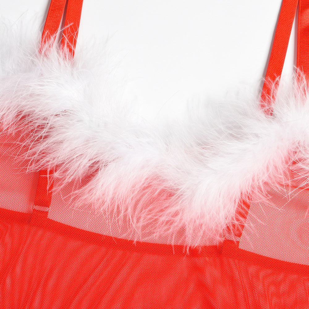 Sensual Lingerie Bodysuit with Fur Hat Women Christmas Red Erotic Lingerie Mesh Hollow Out Valentine's Day Sexy Erotic Costumes