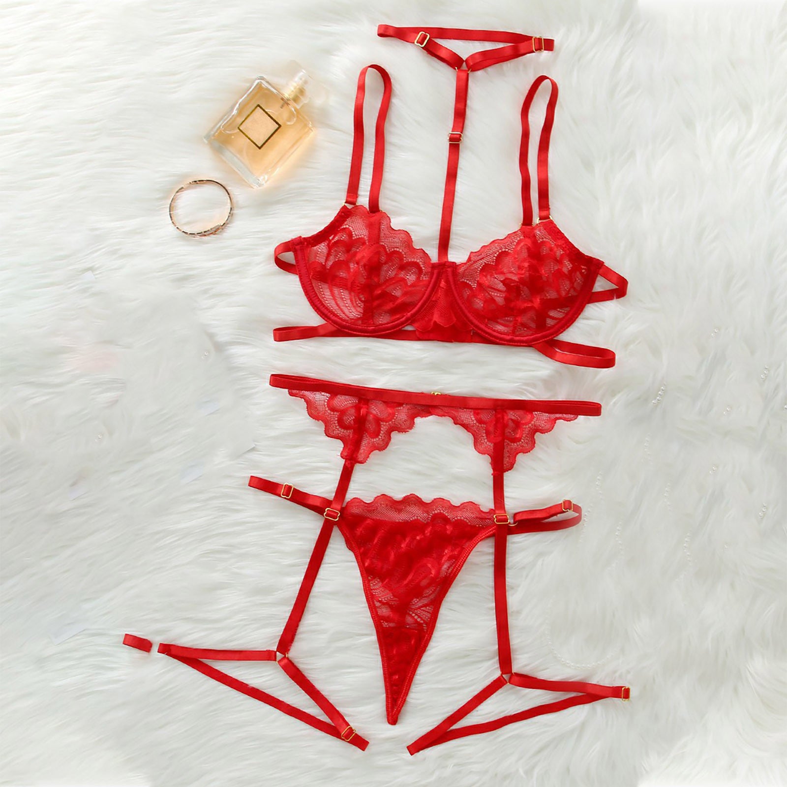 Sensual Lingerie Exotic Costumes Lace Floral Embroidery Underwear Transparent Underwite Bra with Garters and Thongs Sexy Erotic