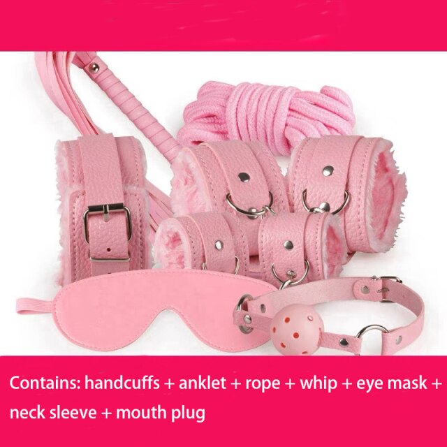 Contains: handcuffs + anklet + rope + whip + eye mask + neck sleeve + mouth plug