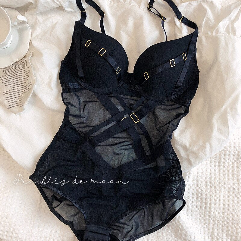 Sexy black gathered breasts bodysuit anti-sagging one-piece underwear body shaping bra set perspective with steel ring