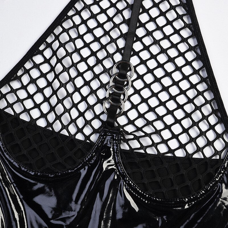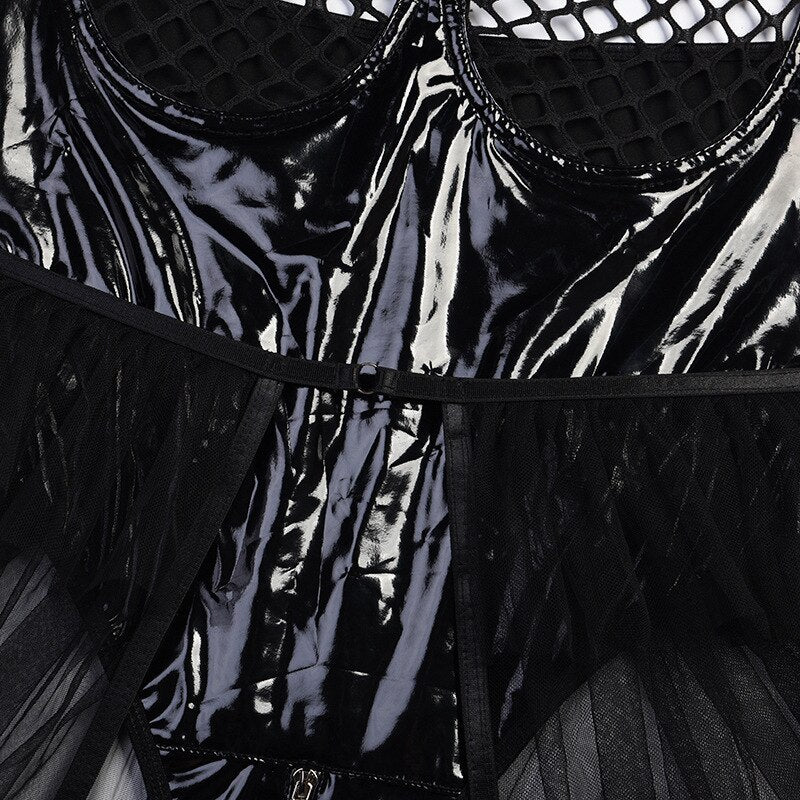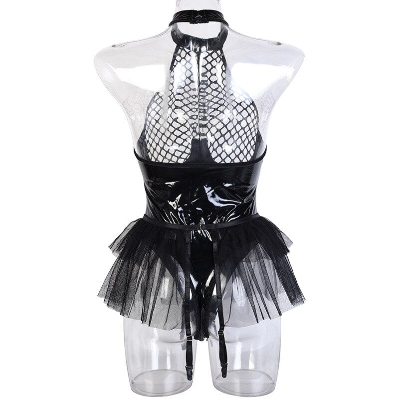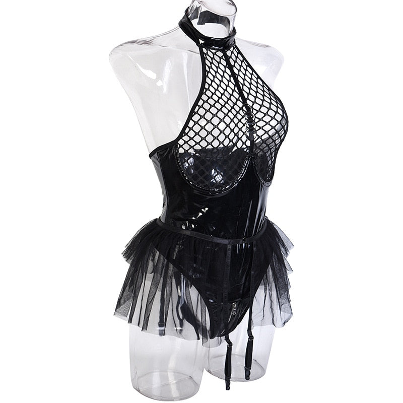 Sexy Black Leather Porn Body Lingerie Women Crotch Zipper Fishing Net Latex Bodysuit Ruffle Garters Halter Sexy Costume Sissy