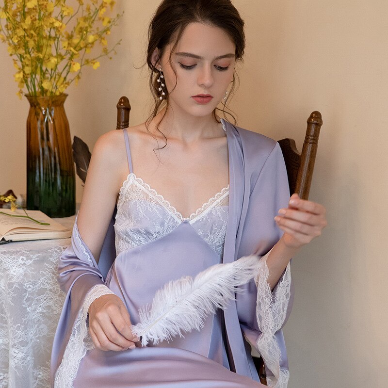 Sexy Spaghetti Strap Nighty&Robe Set Silky Satin Nightgown Twinset Robe Suit Lace Kimono Gown Women Lounge Home Wear Autumn New