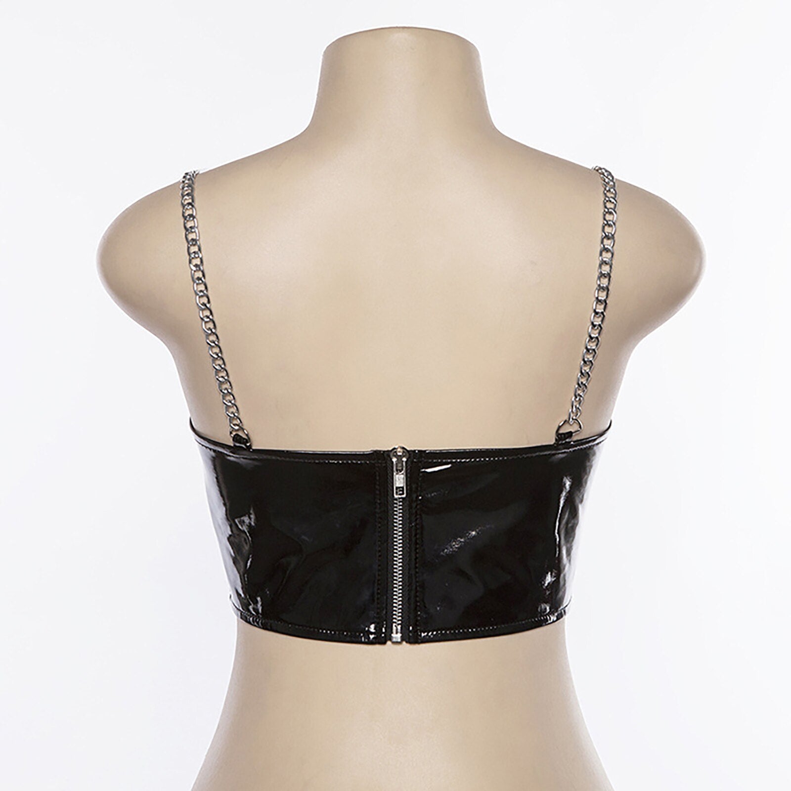 Womens Patent Leather V Neck Camisole Metal Chain Shoulder Straps Crop Top.