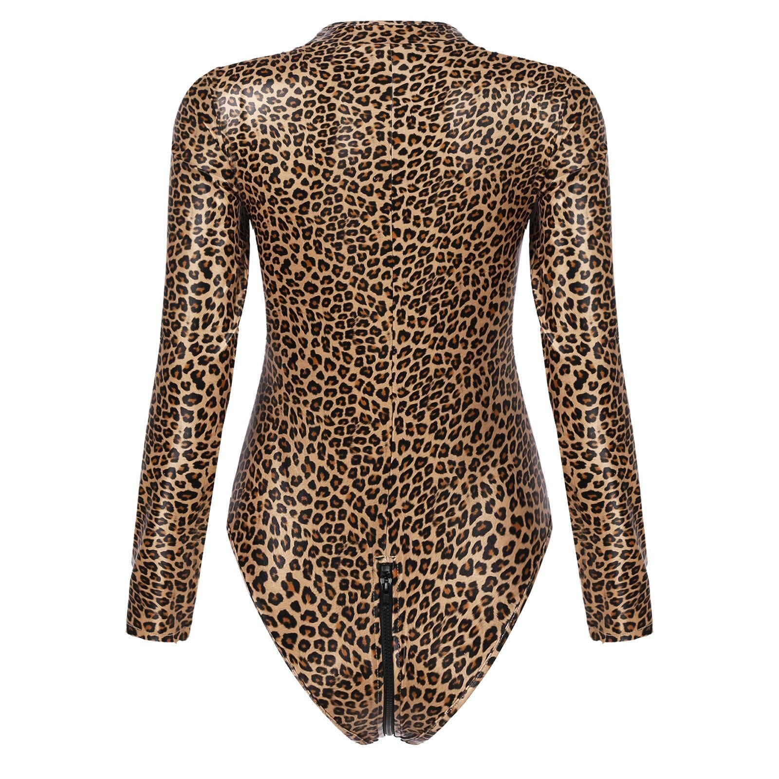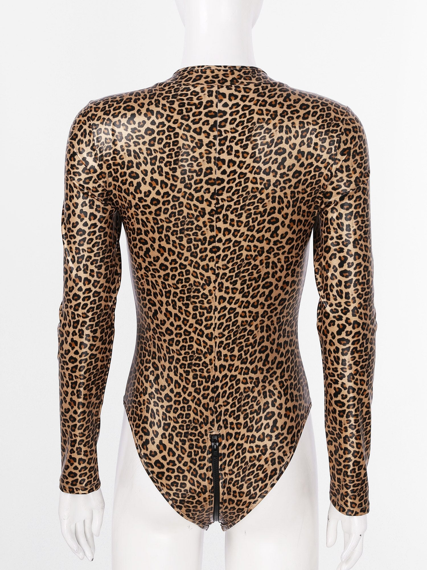 Featuring with leopard print, mock neck, long sleeve, high cut, zipper closure from the neck to the crotch.