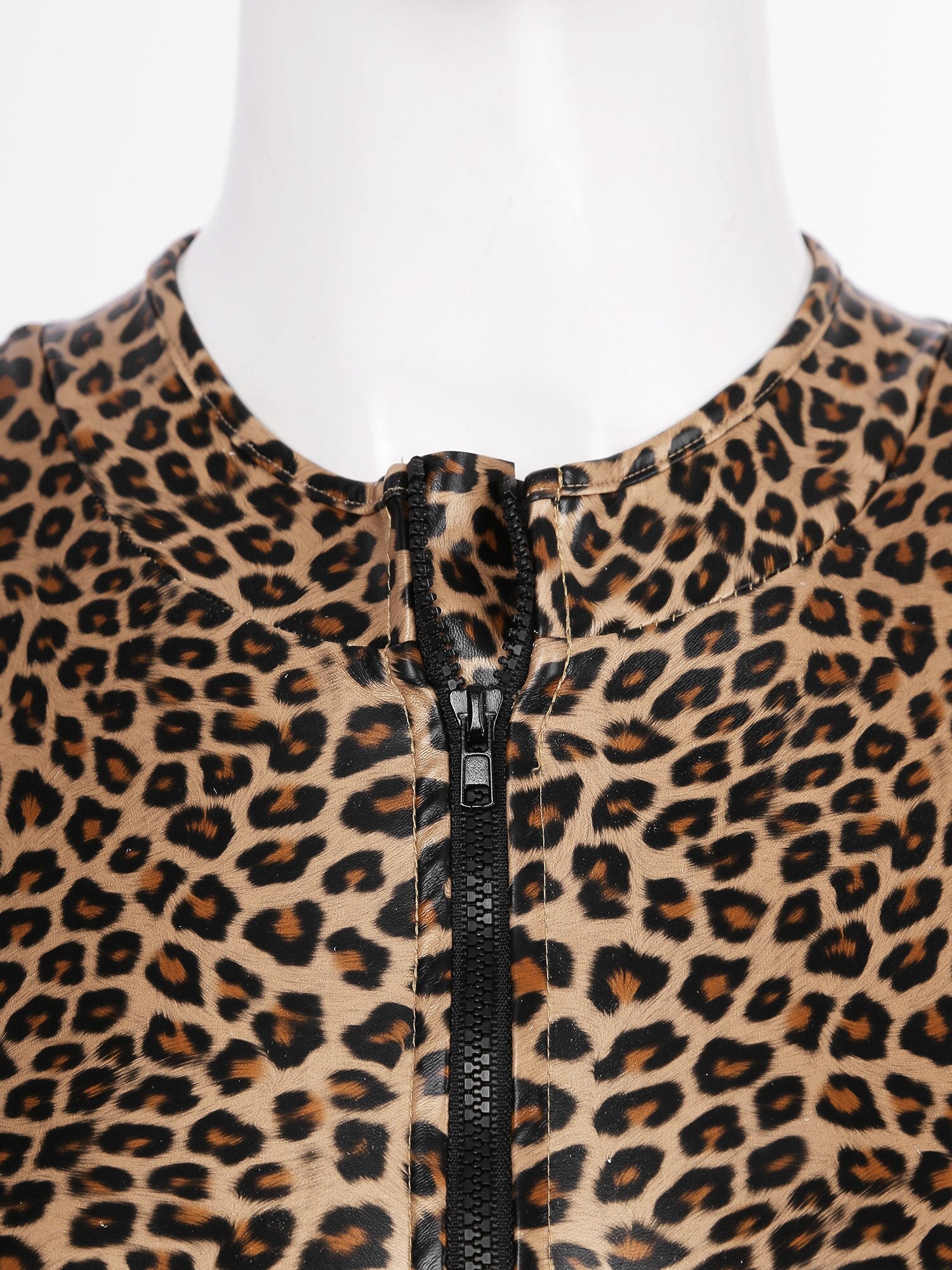 Women Leopard Print Zipper Front Faux Leather Catsuit Mock Neck Long Sleeve High Cut Bodysuit Leotard.