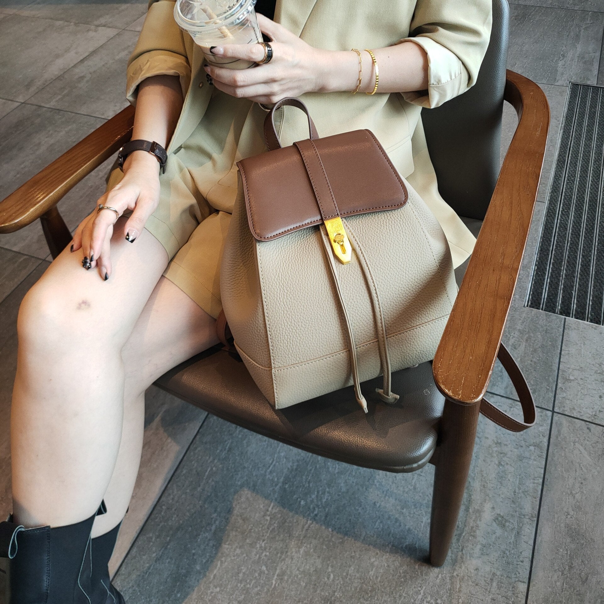 String Close Design Classic Women Backpack Full Grain Cowhide Leather Female Double Shoulder Bag All-match College Schoolbag